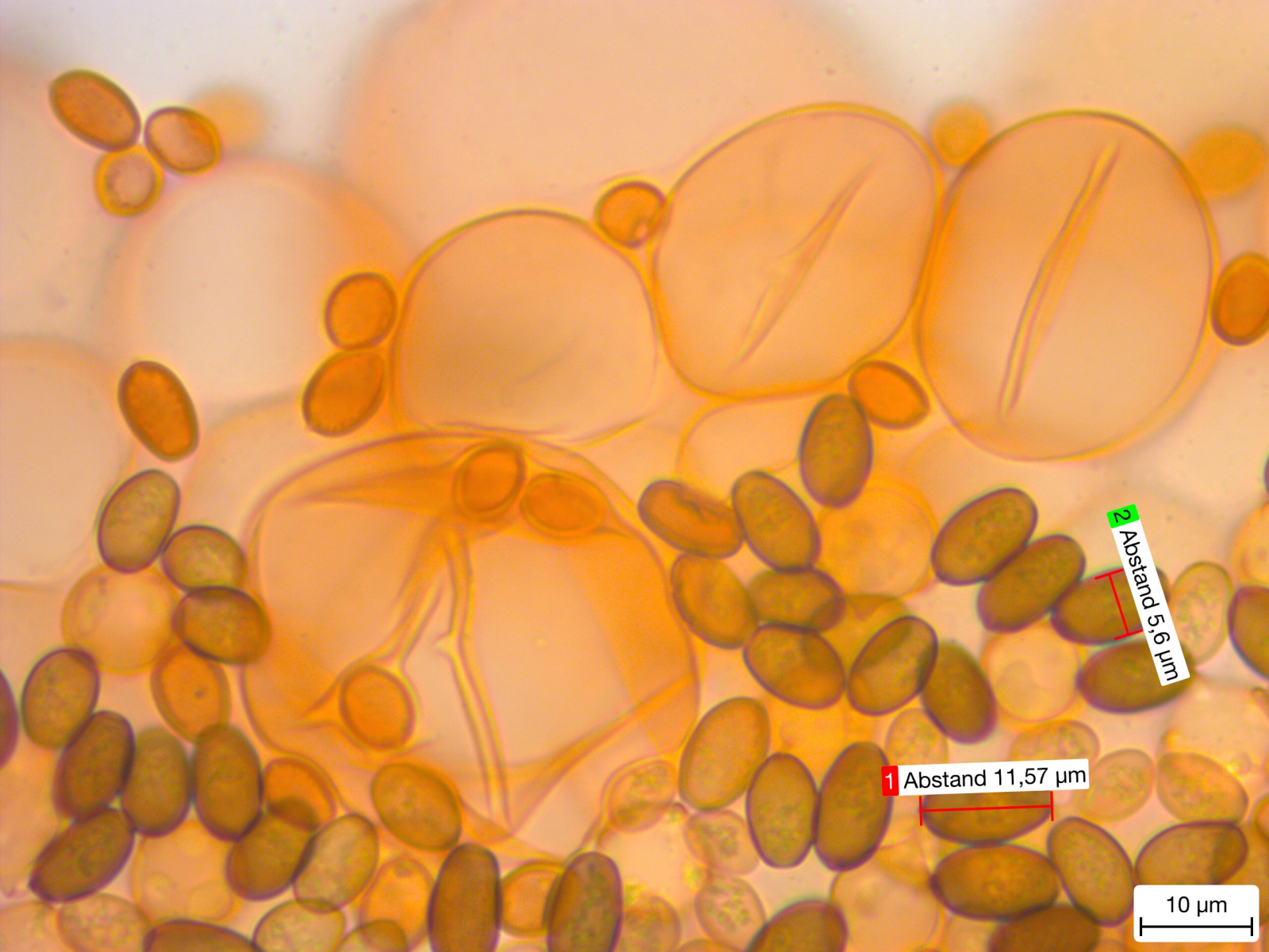 Und hier in der tausendfachen Vergrößerung Sporen und Cheilosystiden.