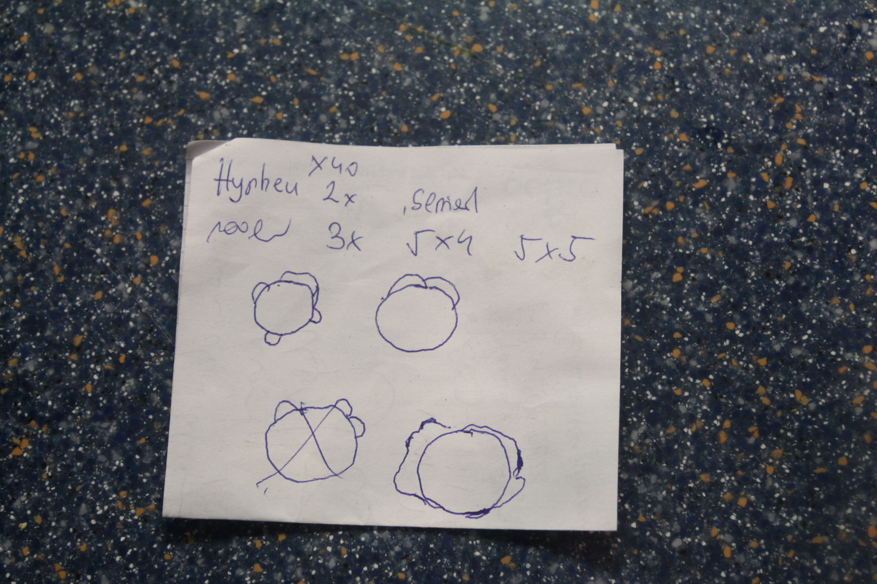 Allerdings konnte ich die Sporenfarbe am Objektträger nicht eindeutig beurteilen, dafür waren es zu wenige, die Schicht nicht dick genug. Von oben betrachtet weis, schräg gehalten war ein sehr schwacher Braunton zu erahnen. Reicht nicht für eine klare Aussage. Dieser Zettel diente als Unterlage für den OT, die braune Verfärbung darauf hat der FK generiert. Könnte allerdings auch durch die austretende Flüssigkeit verursacht worden sein.