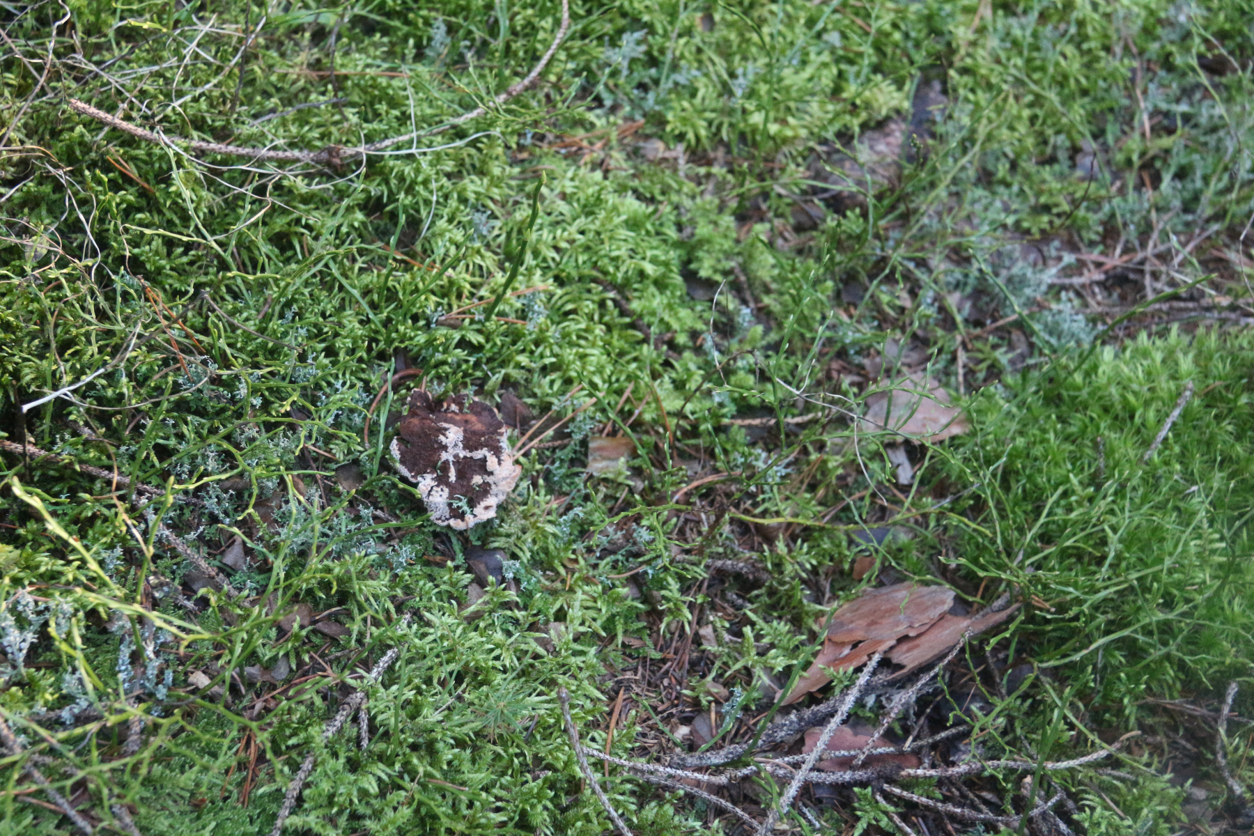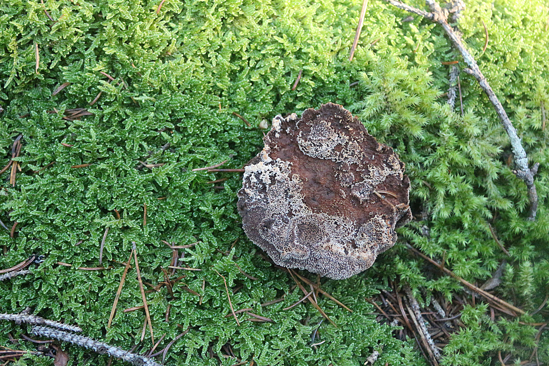 Auffällig ist die stark einheitlich beflaumte Oberseite, die einerseits ungezont, andererseits auch nicht in grobe Zacken, Fransen, Schuppen bzw. Kämme aufbricht, wie es laut Beschreibungen bei Hydnellum scrobiculatum sein soll. Wobei man da natürloich berücksichtigen muss, daß der Fruchtkörper sehr jung sein könnte.