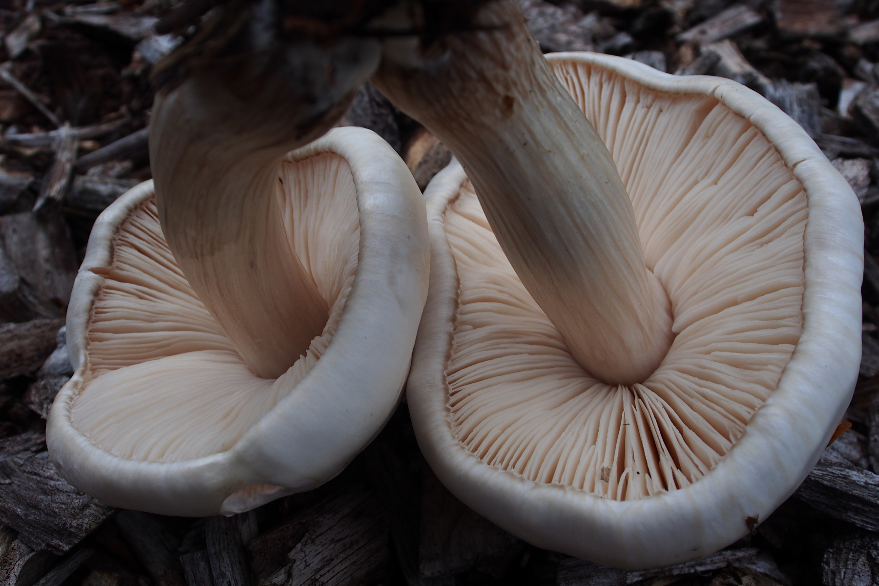 Ich vermute den Weißen Dachpilz (Pluteus pellitus). 2017 habe ich die Pilze dort schon mal fotografiert (siehe letztes Foto), sogar beim Fotowettbewerb eingereicht. Aber sie waren schon so alt und in der Hitze gedörrt und geröstet, dass ich den Rehbraunen vermutet hatte.