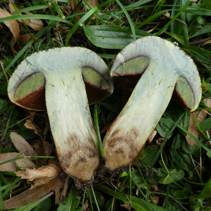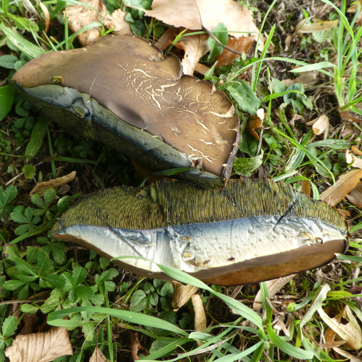 Beim zweiten Exemplar wäre ich mir nicht so sicher, da die Bataille-Linie augenscheinlich nicht vorhanden ist. Auf die Farben des Pilzes kann man sich leider nicht mehr verlassen, da der Pilz bereits stark überständig ist. MMn ist hier auch der Wurzelnde Bitterröhrling nicht unmöglich. Leider fehlt hier das Bild vom Längsschnitt, so gäbe es mehr Bestimmungsmerkmale.