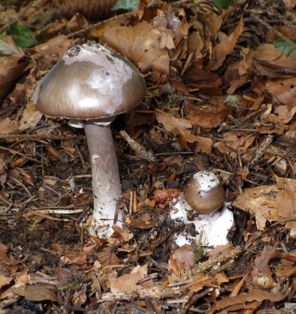 der größere der Grünen Knollenblätterpilze hat sehr wohl einen Ring - nur ist der beim Aufschirmen leider nicht am Stiel, sondern diesmal am Hutrand hängen geblieben, sodass hier eine Ringlosigkeit vorgetäuscht wird.