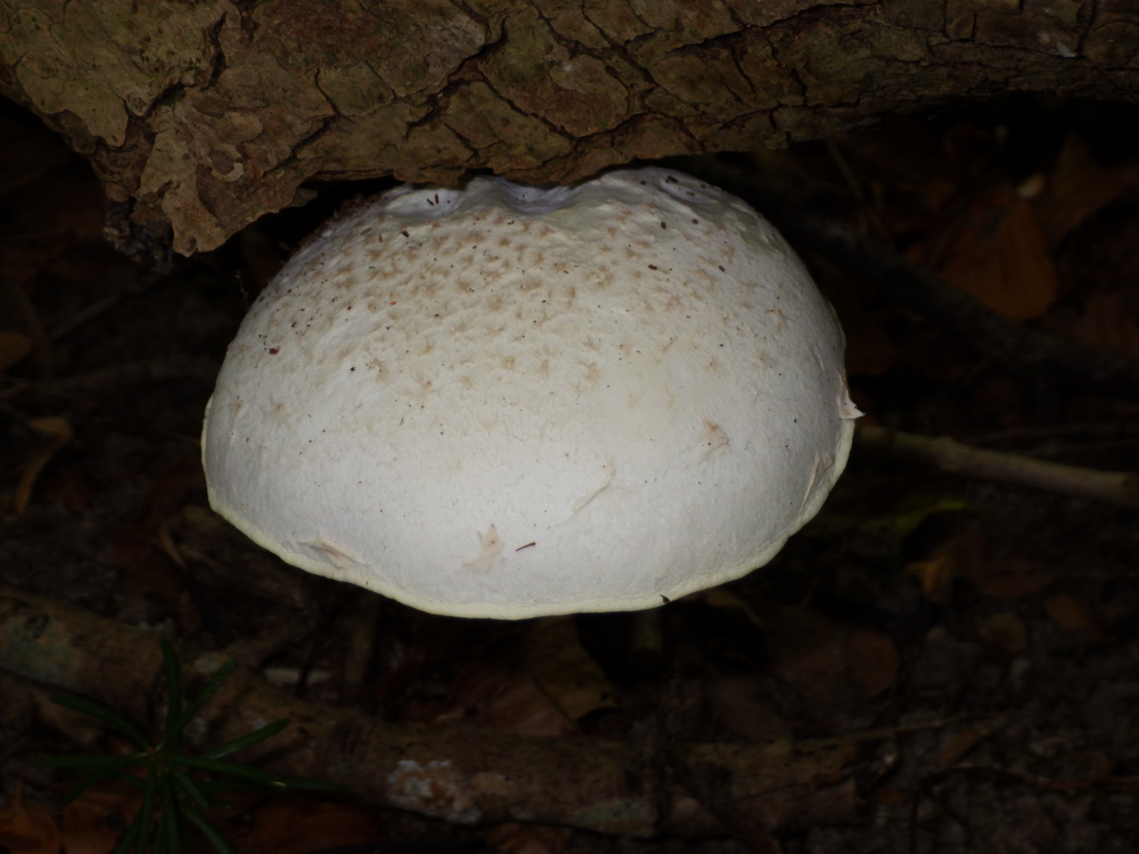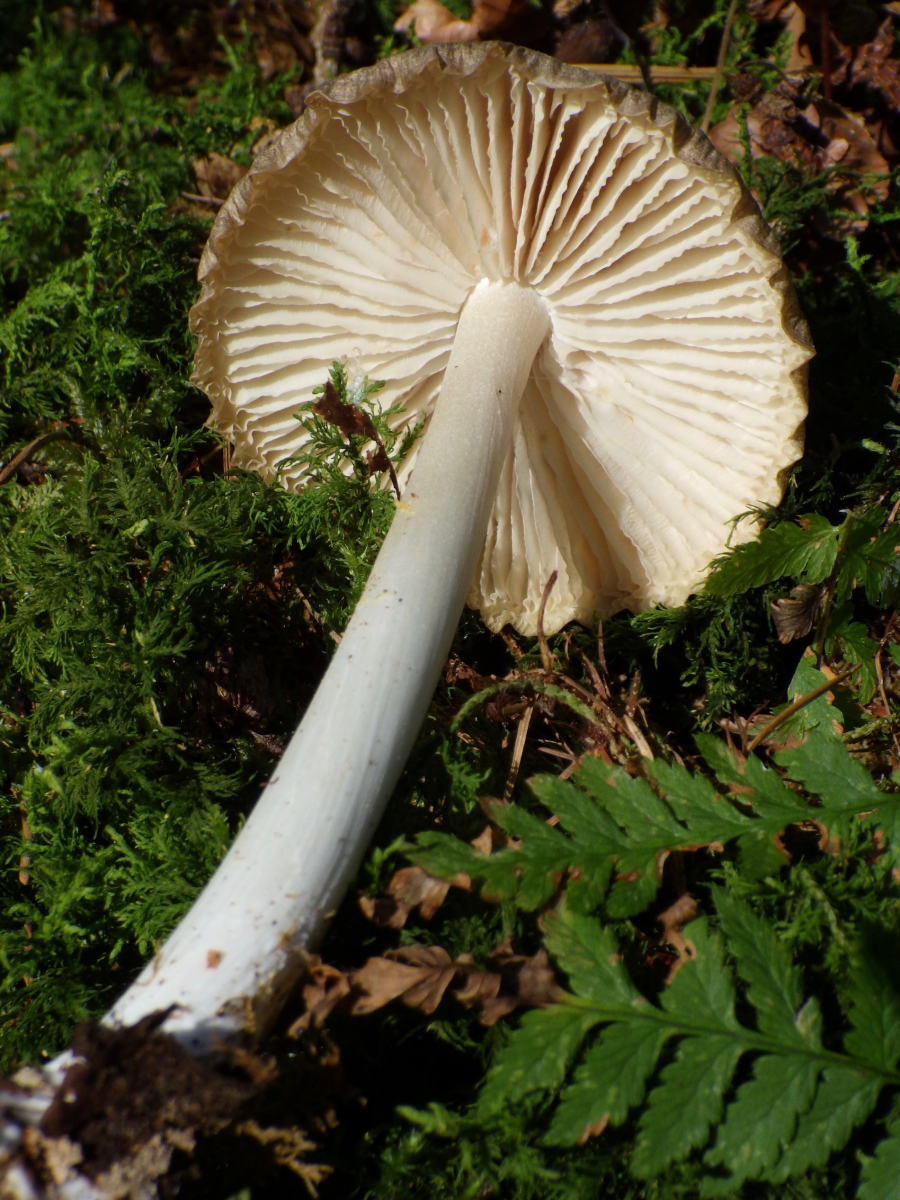 10) Fast grauer Hut mit Streifen sonst weiss, wuchs einzeln aus einem Moss-überwuchernden Totholz