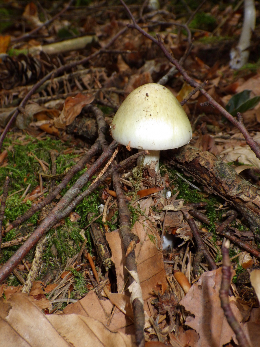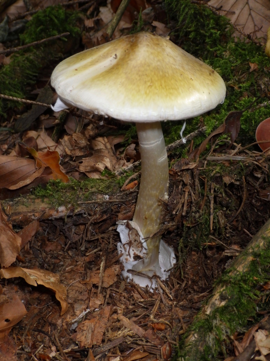 8) Zuerst dachte ich an einen Gelben Knollenblätterpilz, fand aber keinen richtigen Ring, nur eventuell am Stiel kleinste Ringspuren ganz oben auf dem Bild, sonst würde für mich vieles stimmen! Es wuchsen direkt nebeneinander 2 grössere und ein noch ganz kleiner Pilz