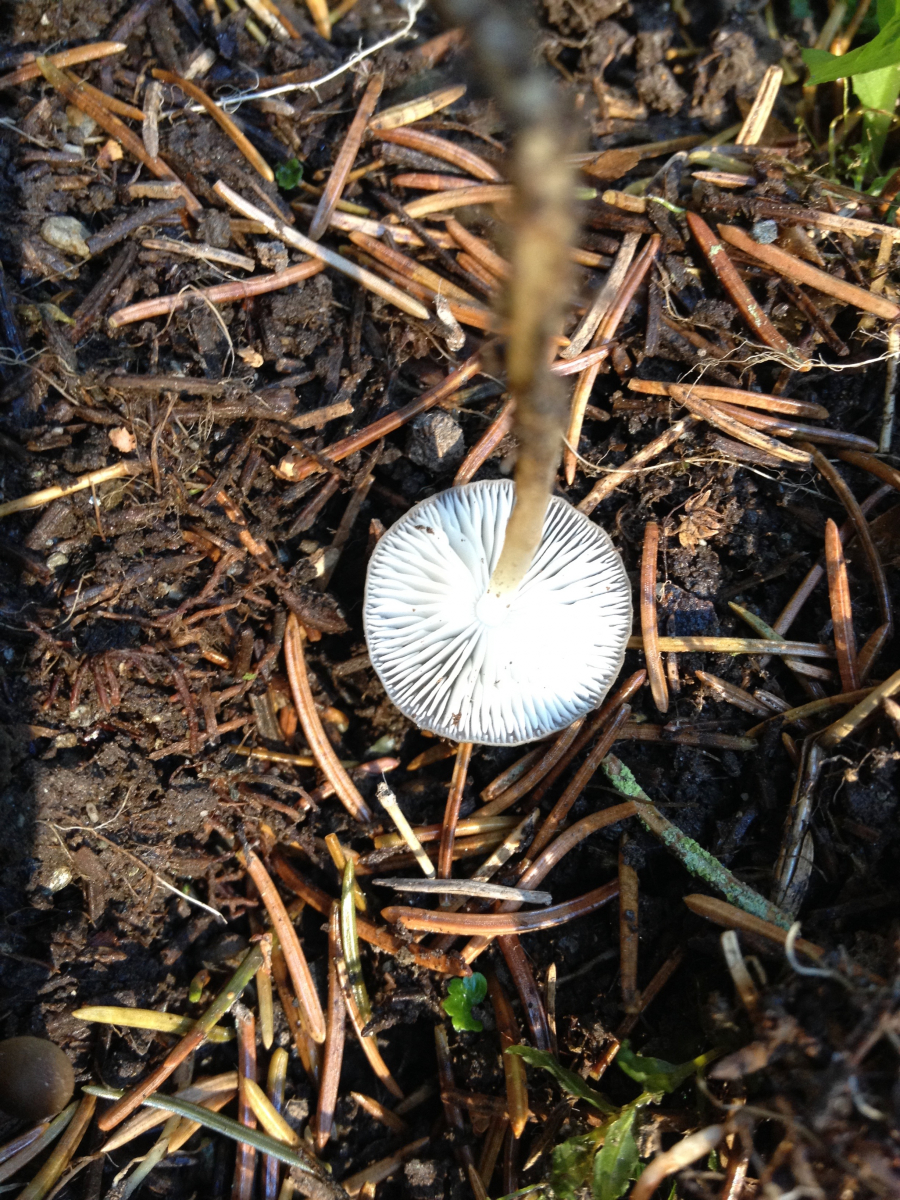ich habe da ein seltsames Pilzgewächs gefunden. Makroskopisch würde ich auf Helmling tippen. Er stand auf Fichtenstreu in Bachnähe und hat einen ziemlich markanten Chlorgeruch. Ich bin auf Mycenae strobilicola, den Fichtenzapfen-Helmling gekommen, der sehr ähnlich ist. So weit, so gut.