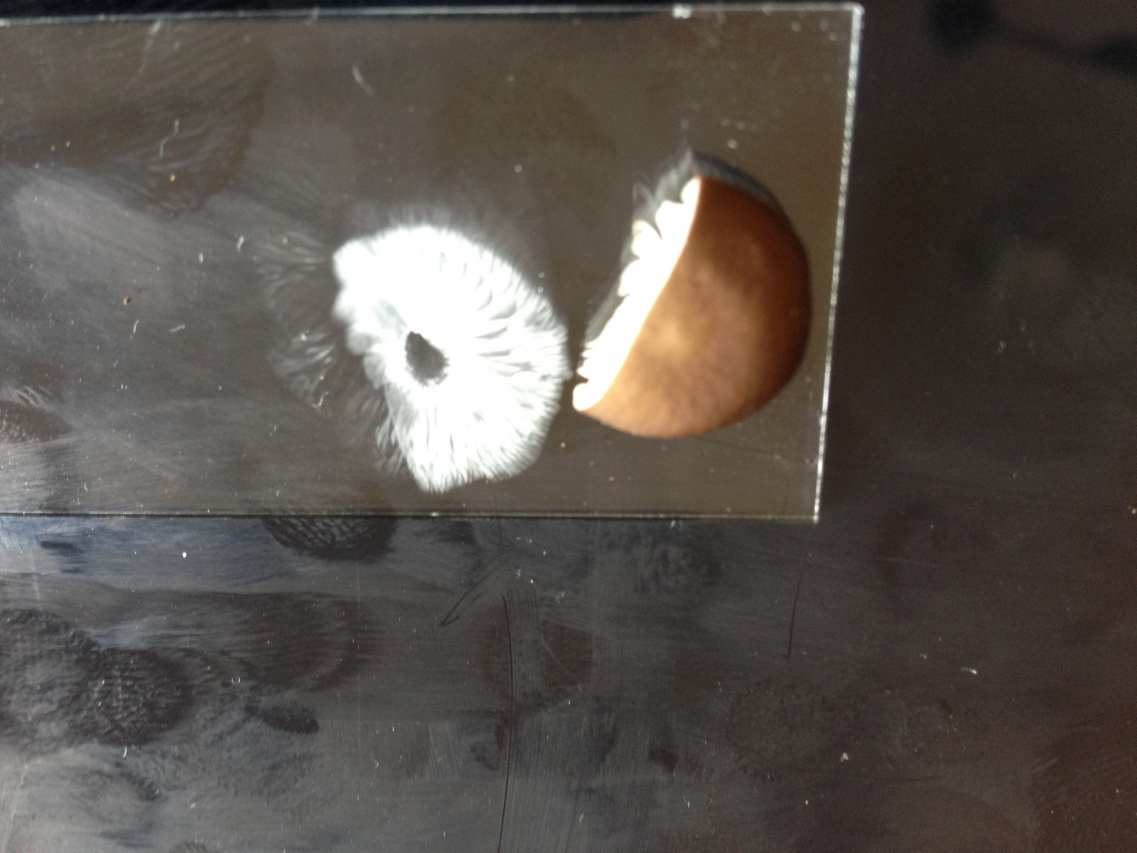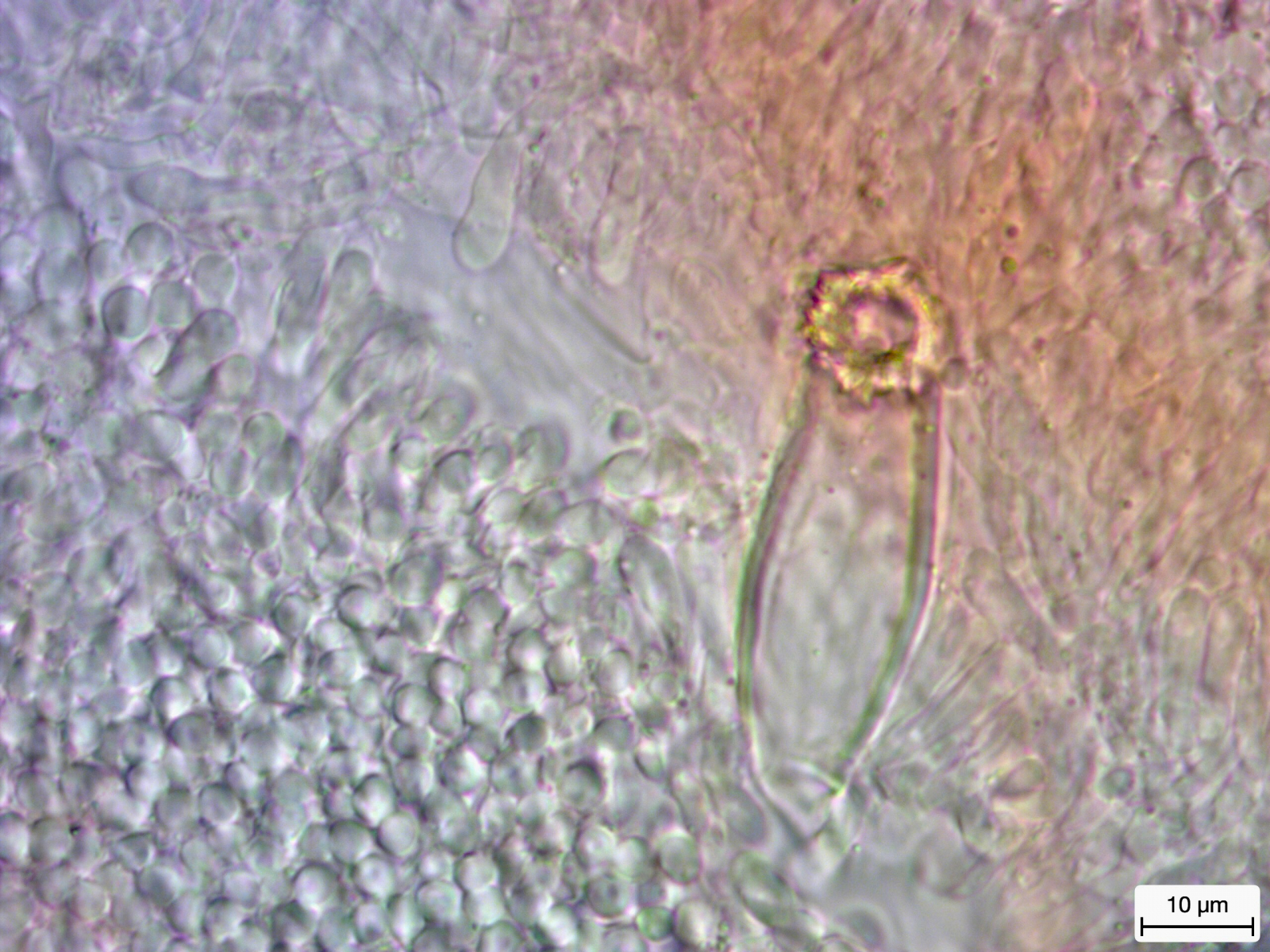 Aber der Blick durchs Mikroskop auf die inneren Werte hat mich dann ein bisschen ratlos gemacht. Da sind gigantisch große Cheilozystiden, die offenbar einen Kristallschopf haben