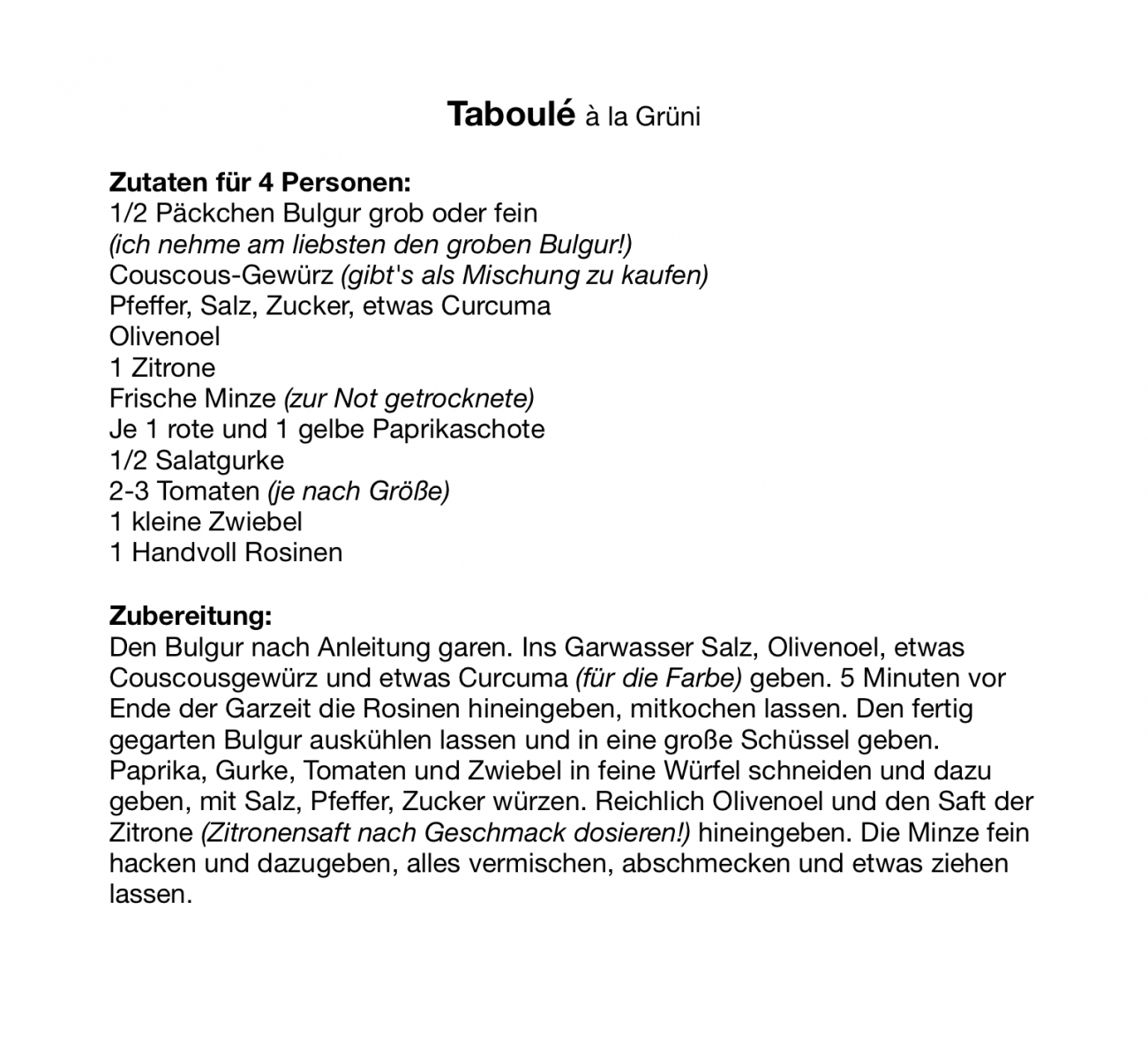 Dodo fragte mich etwas zu meinem Taboulé. Leider konnte ich es ja erst am letzten Abend zubereiten, und so haben es nur die "Montagsleute" probiert. Hier für Interessierte mein Rezept (so habe ich es in Frankreich kennengelernt). Es gibt auch viele andere Rezepte, zum Teil mit sehr viel Blattpetersilie, so, wie es auch einige von euch beschrieben haben. Kann man natürlich auch alles nach eigenem Geschmack variieren...