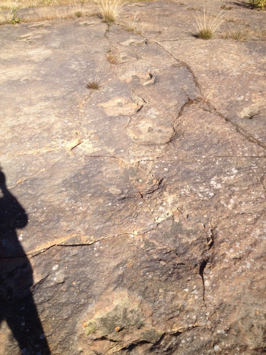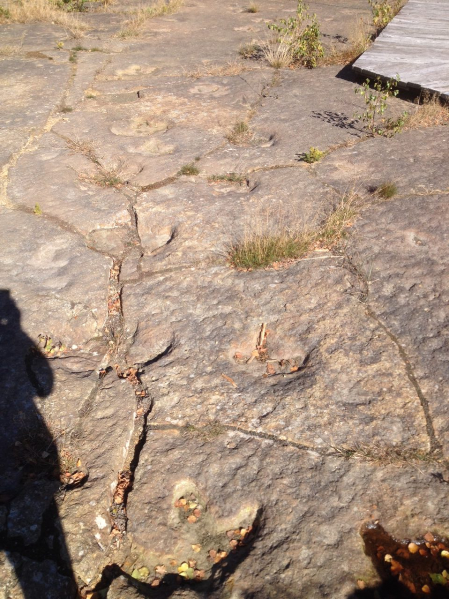 Aus der Größe der Laubblätter kann man die Größe der Spur extrapolieren: ca. 40 cm lang und breit; war also ein relativ kleiner Dino.