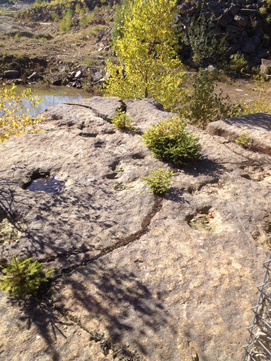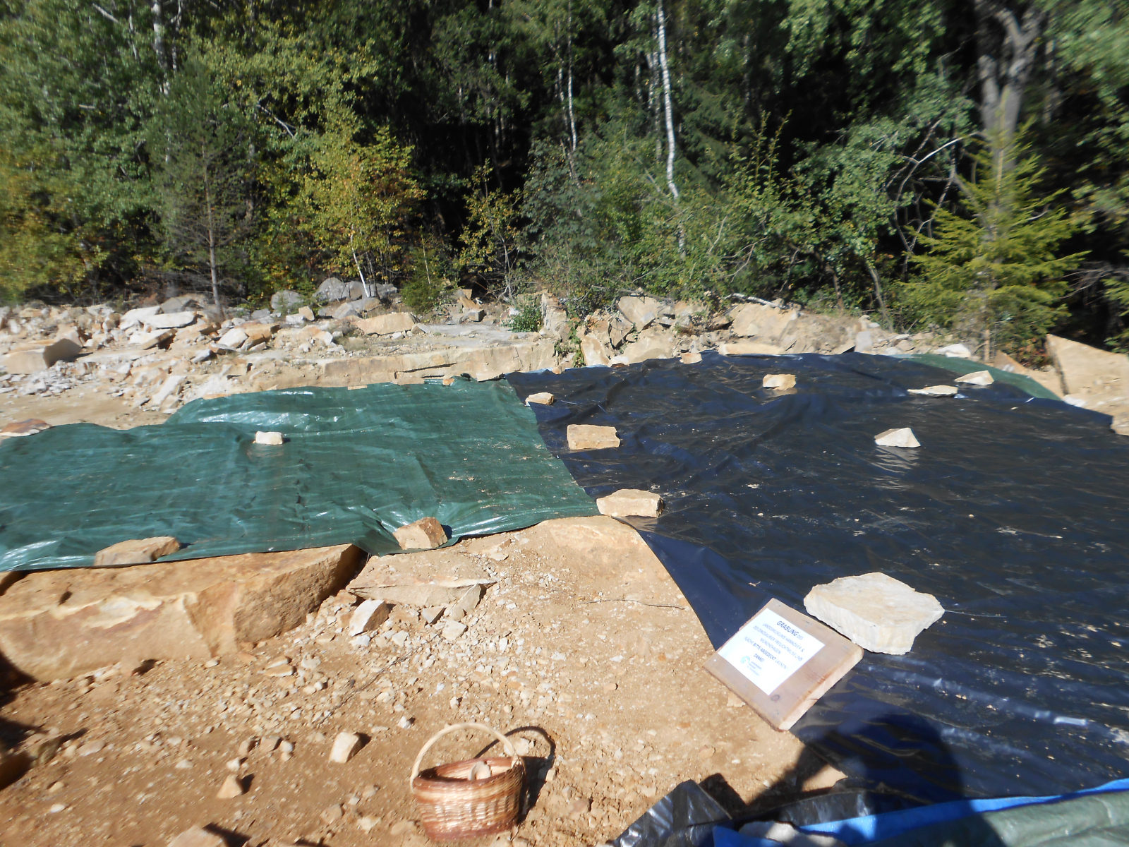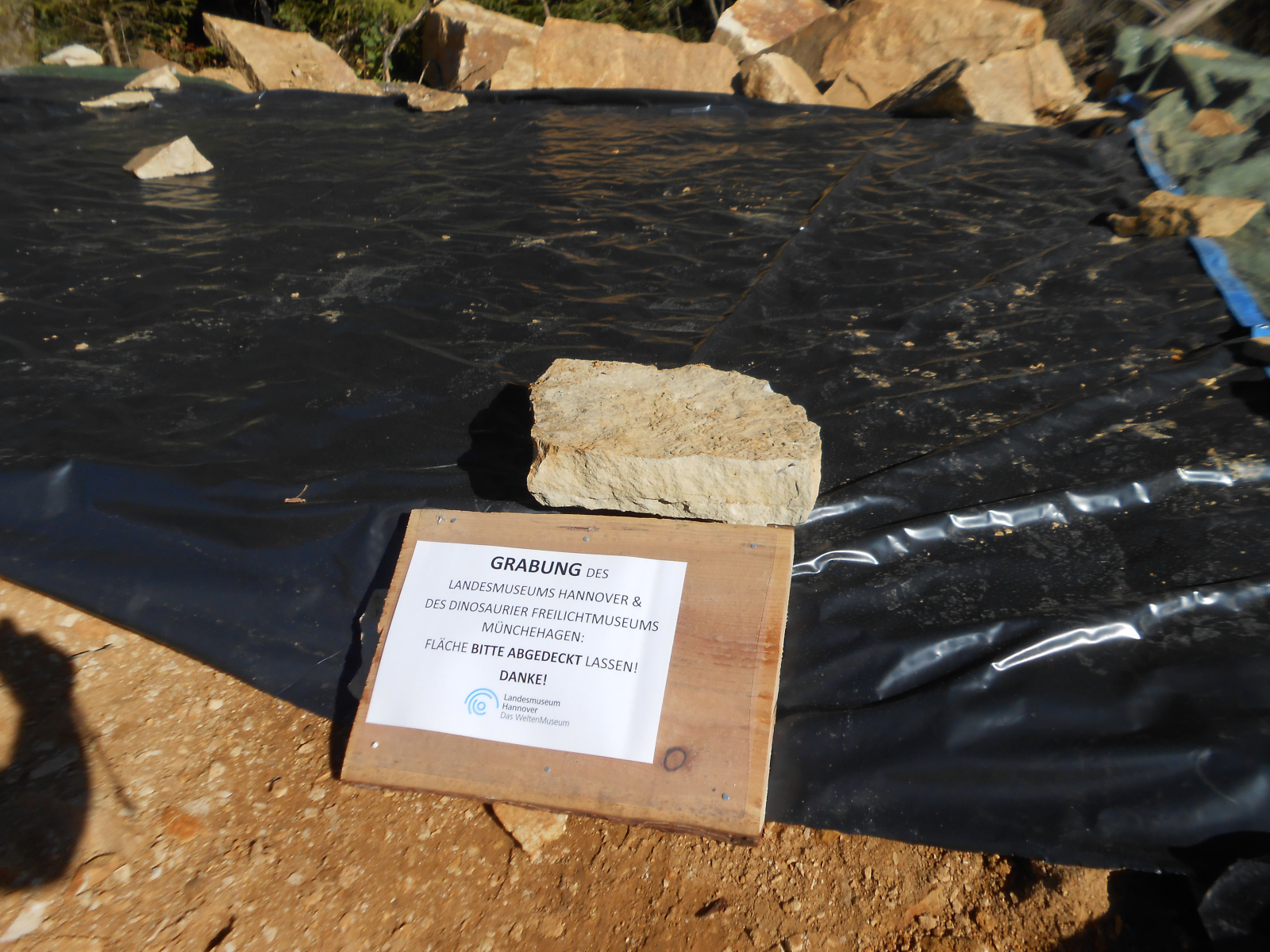 Irgendwann mitten in der Steinbruchtour hatte ich mich etwas von der Gruppe entfernt und im noch bearbeiteten Teil des Steinbruchs herumgeschnüffelt. In diesem, noch aktiven Abschnitt des Steinbruchs geht es mit dem Graben nach Saurierspuren weiter. Paläontologen haben neue Fundschichten aufgetan, die, mit einer Plane bedeckt, ihrer Auswertung und Präparation harren. Ich konnte leider, trotz vorsichtigem Lüpfen der Plane, nix erkennen, da die neuen Spuren wohl mehr in der Mitte waren.