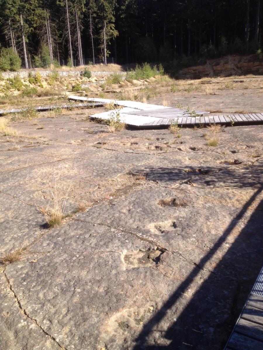 Auf solchen Holz-Laufstegen durfte man die fussballfeldgroße Gesteinsplatte mit den Saurierspuren überqueren.