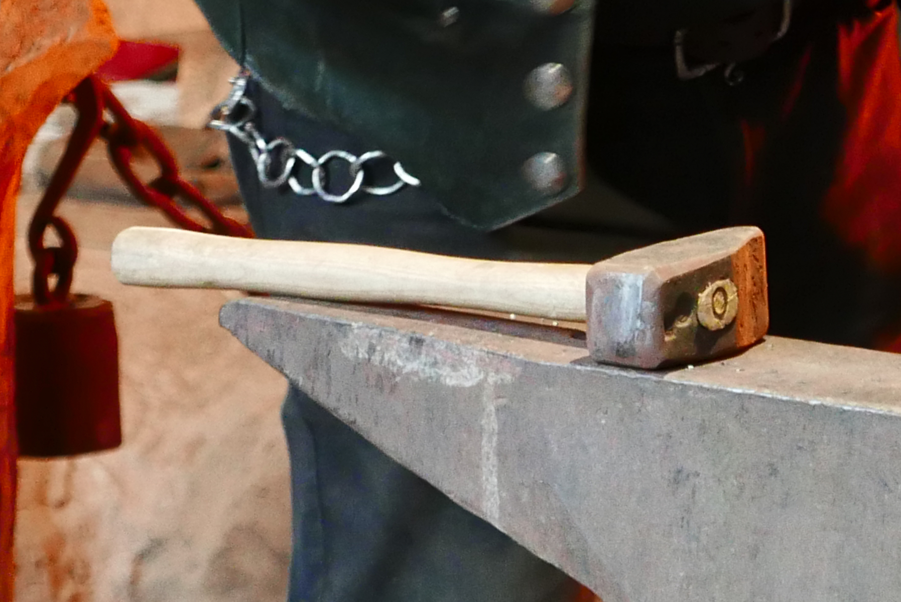 Vor dem Amboss liegt das Herz daß der Schmied zuvor angefertigt hat um die Arbeit zu demonstrieren.