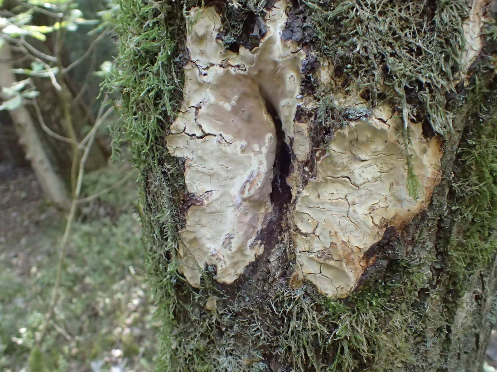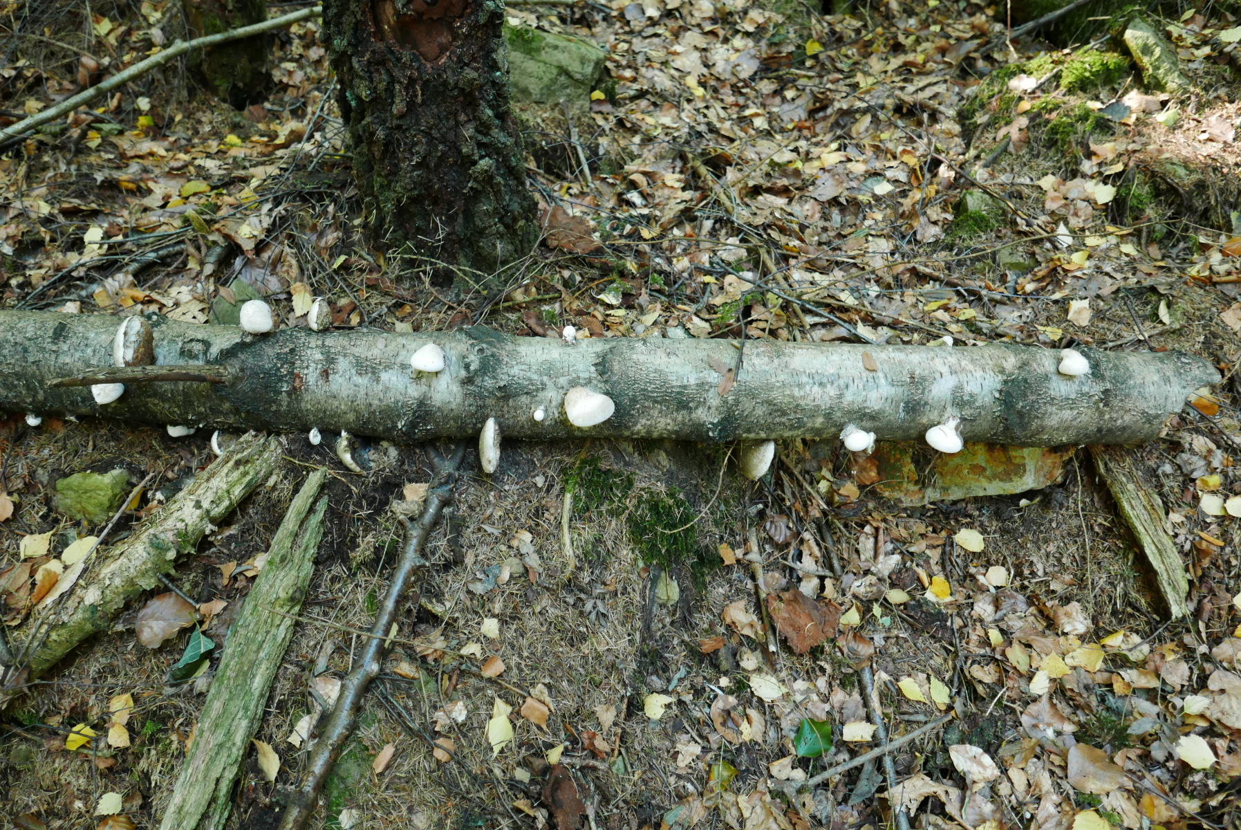 Birkenporlinge, gaanz viele kleine Fruchtkörper an liegendem Stamm