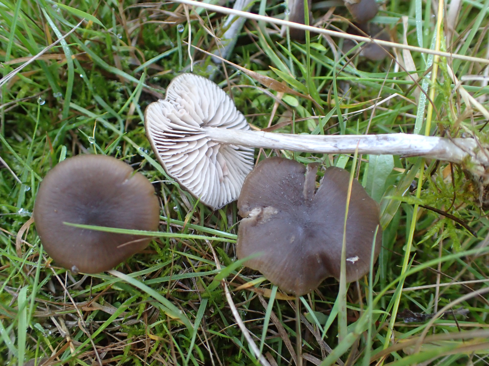 Unsere Theorie war Entoloma caeruleum. Ich hab Karl ein paar Frischpilze mitgebracht und ihm fiel anhand der z. T. gefärbten Lamellenschneiden auf, dass es sich um eine Mischkollektion handelt, also zwei Arten durcheinander wuchsen. Die bleiben also unbenamst.