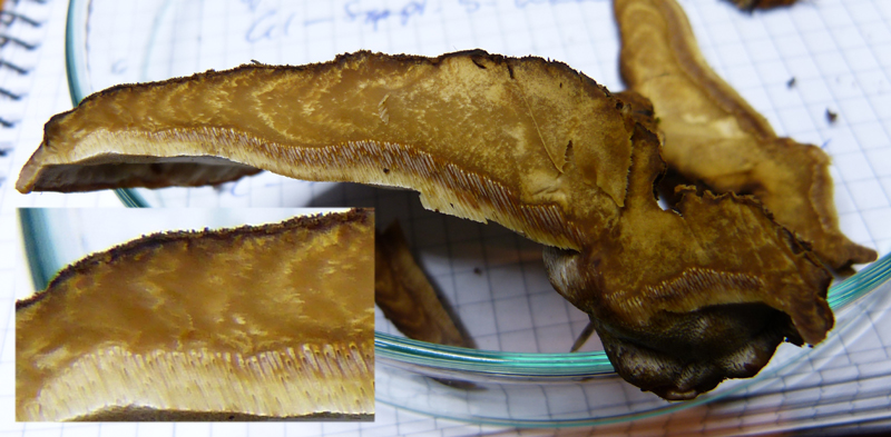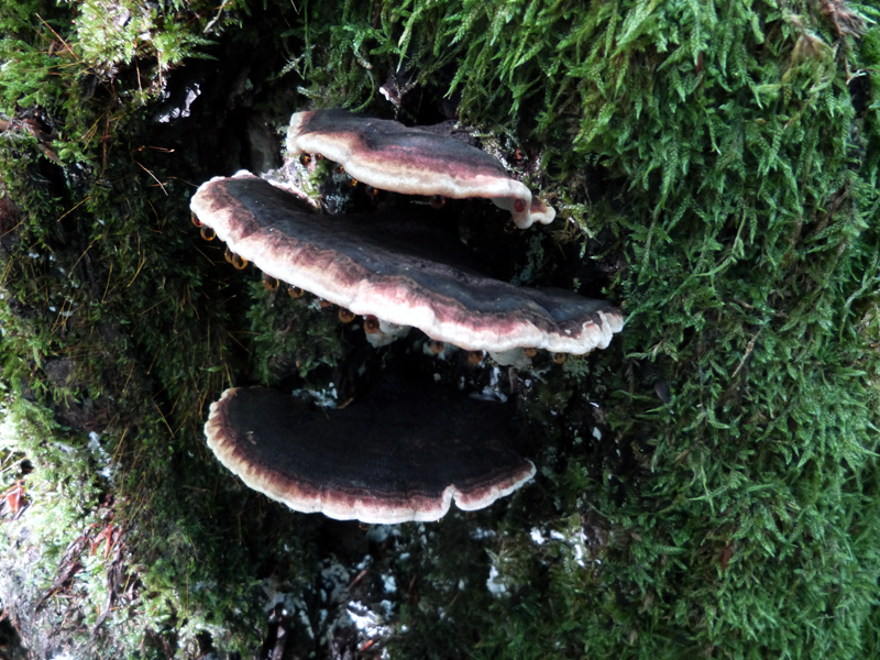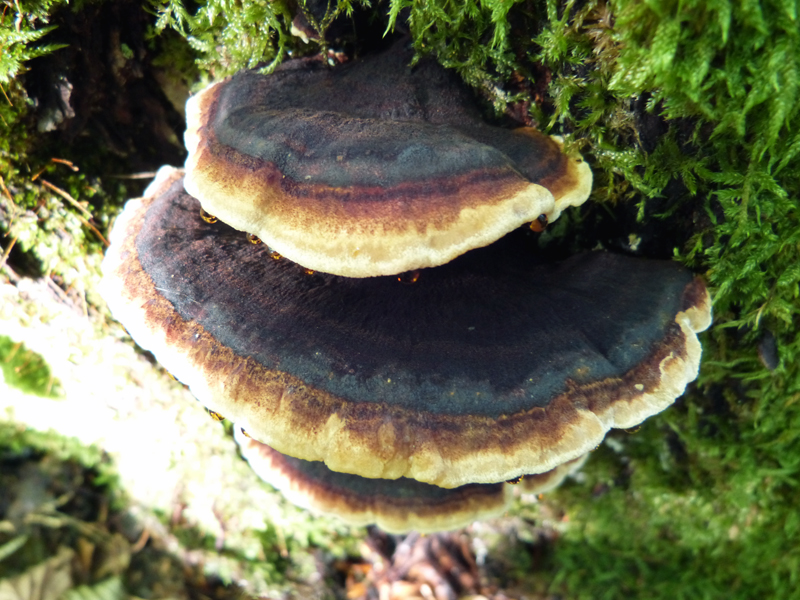 Die Fruchtkörper wuchsen an einem für mich nicht bestimmbaren, älteren Stumpf mit "Weissfäule-Zersetzung" (breites Spektrum an Laub - und Nadelbäumen vor Ort). Die FK rochen unbedeutend, ein wenig säuerlich vielleicht. Die Konsistent war recht weich-biegsam. Die hellen Zonen waren bis auf einen wenige Millimeter schmalen, verbleibenden hellen Hutrand schon wenige Stunden später nicht mehr vorhanden, dafür zeigten sich fast schwarze Zonierungen auf dunkelbraunem Grund, die ich zunächst nicht (?) gesehen hatte. Hmenophor bei Berührung sofort dtl. bräunend.