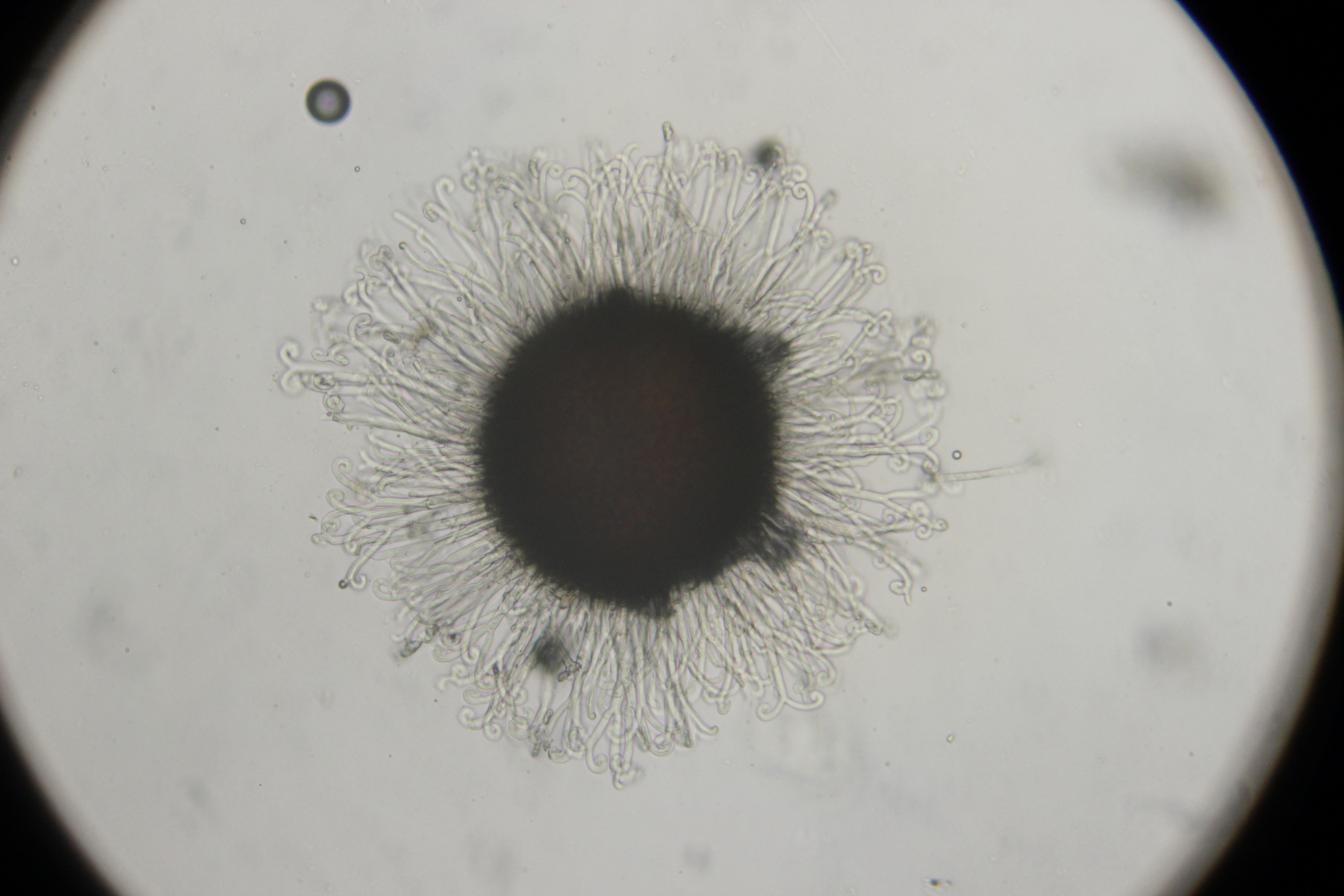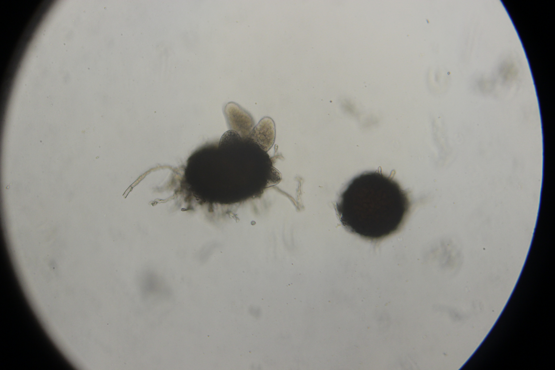 6. Mehltau auf Ulmus sp. Die Anhängsel sagen uns, daß es sich um eine Erysiphe und nicht um Phyllactinia handelt. Stellt sich die Frage, ob die Anhängsel-Enden spiralig gewunden sind oder nicht. Für mich sieht es spiralig aus, womit ich bei Erysiphe kenjiana landen würde. Wenn ich mir aber auf Jules Seite Erysiphe ulmi anschaue, sieht das für mich auch spiralig aus...