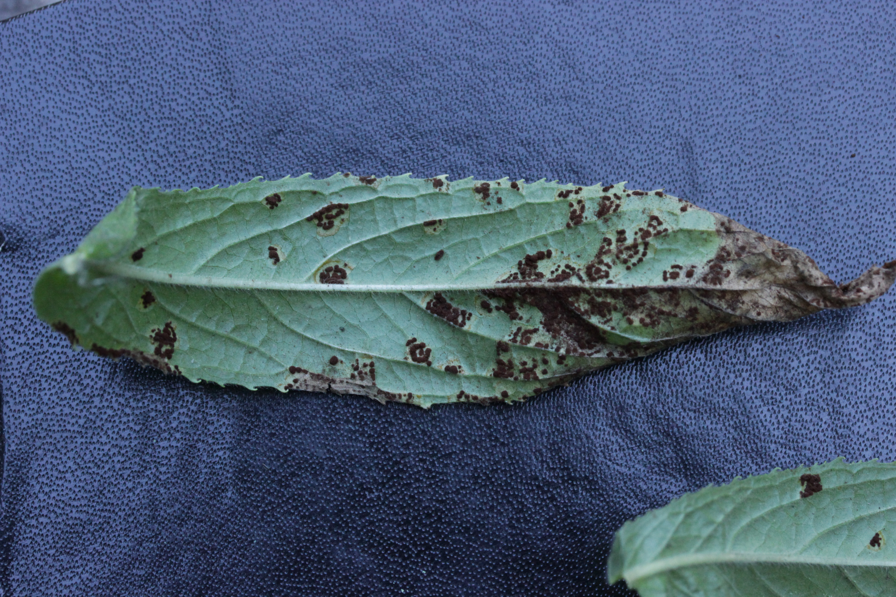10. Hier würde ich bei der Wirtspflanze auf Epilobium sp. setzen. Wir sehen Telien, können also im Klenke direkt zu 4 gehen. Die Telien sind nicht von der Epidermis bedeckt, also weiter zu 5. Deformiert sieht die Pflanze nicht aus, also über 5* zu 7. Die Telien sind pulverig, also weiter zu 8. Wie E. fleischeri sieht das nicht aus, also lande ich bei Puccinia pulverulenta.