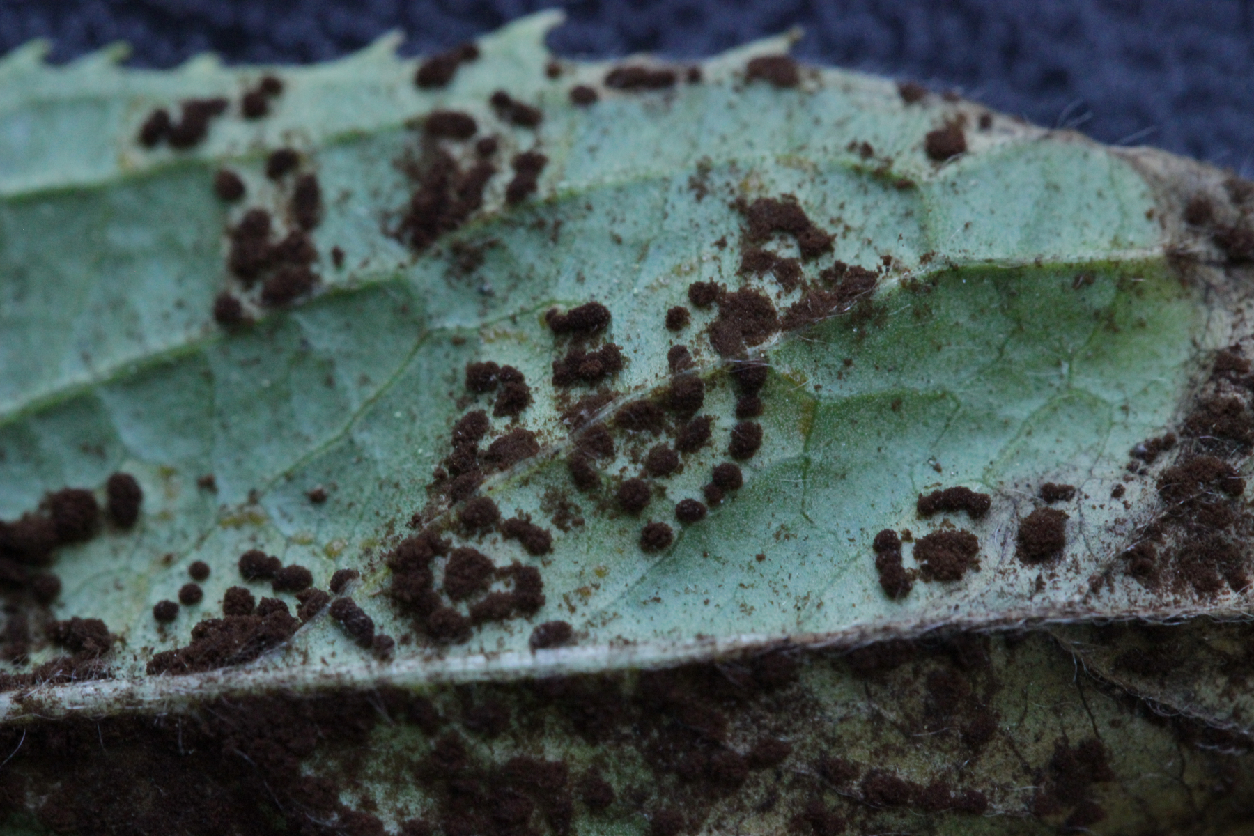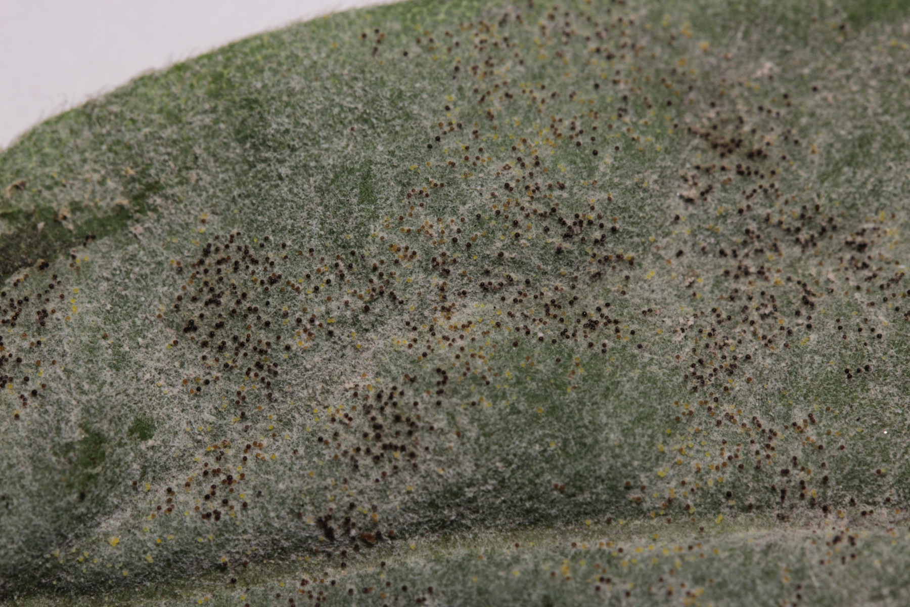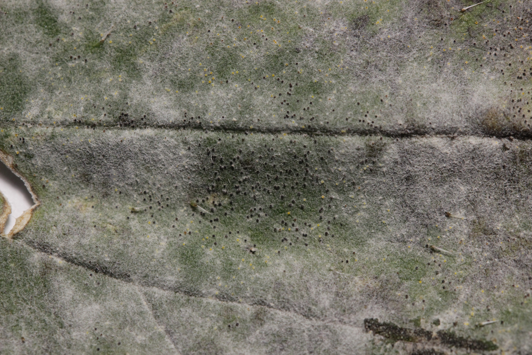 15. Erysiphe elevata auf Catalpa sp., dank langer Anhängsel an den Fruchtkörper zu erkennen.