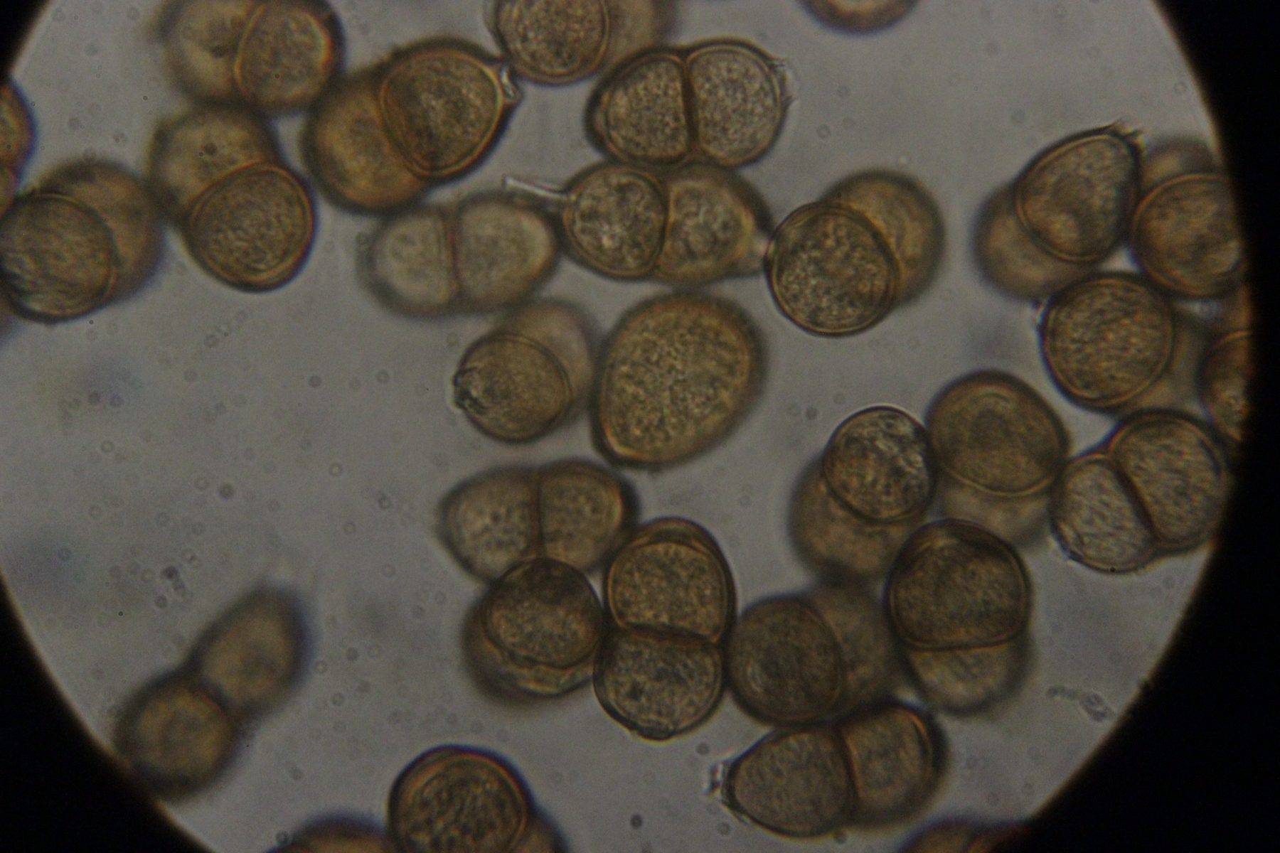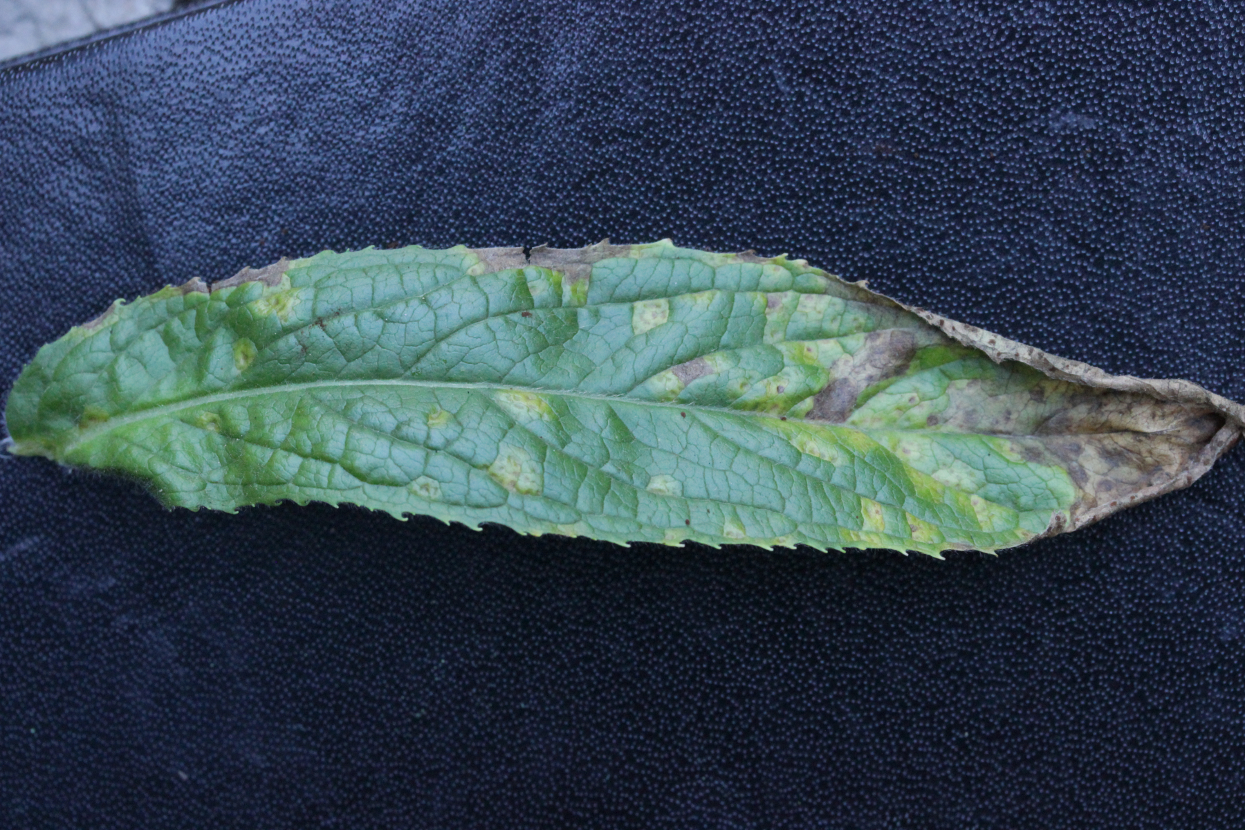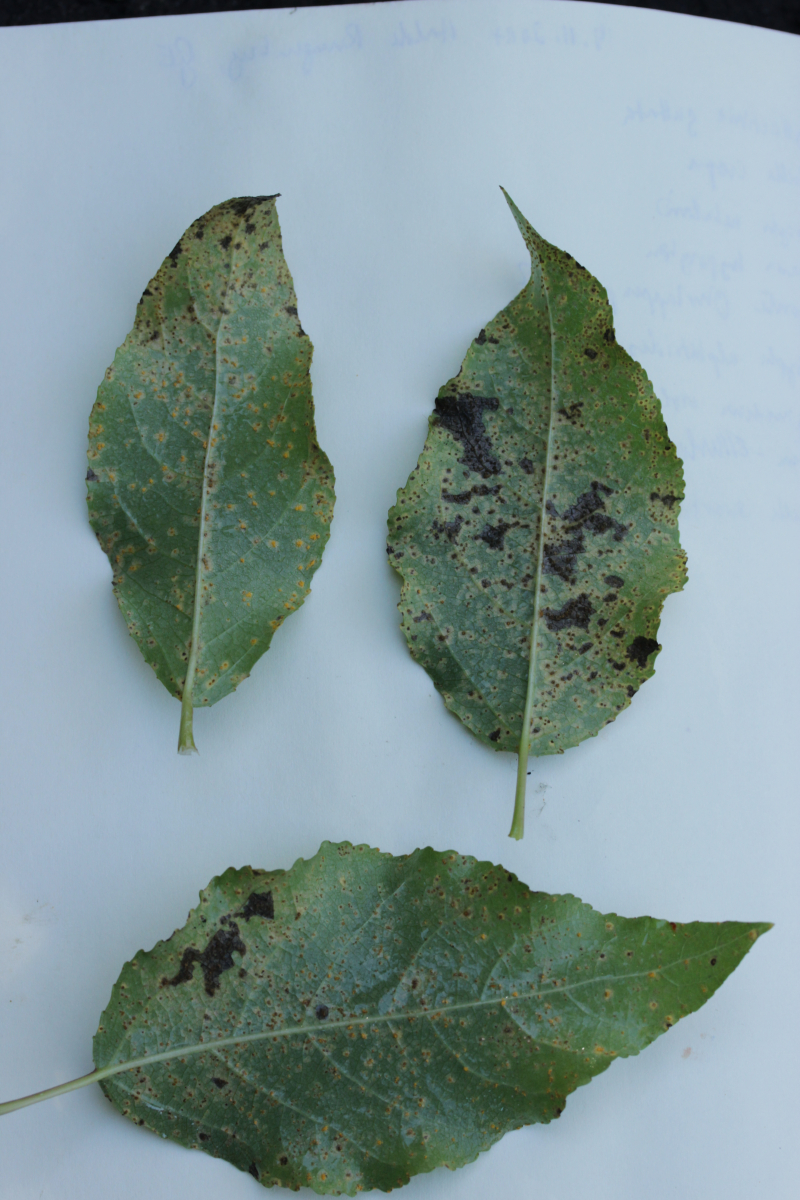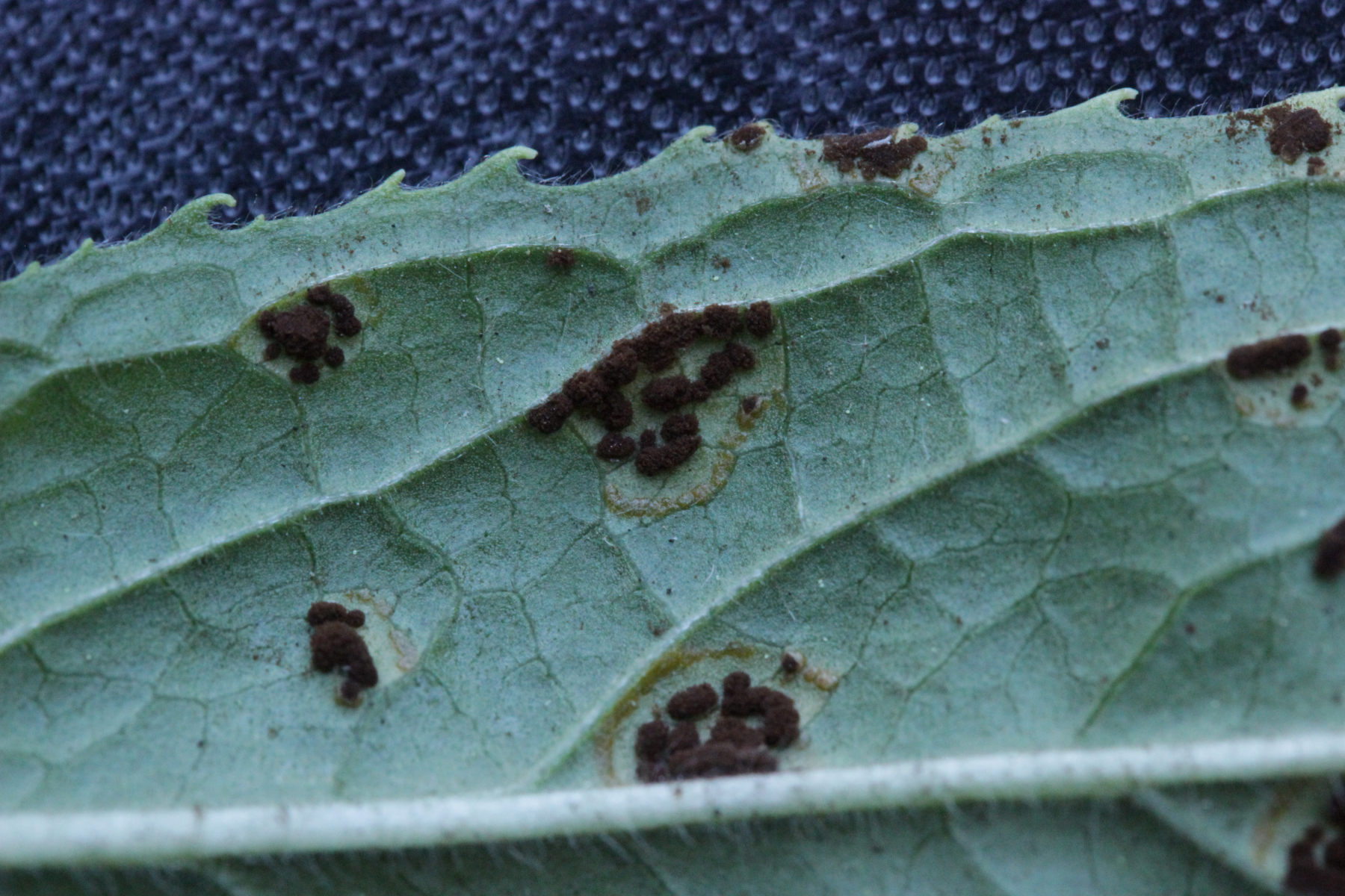 10. Hier würde ich bei der Wirtspflanze auf Epilobium sp. setzen. Wir sehen Telien, können also im Klenke direkt zu 4 gehen. Die Telien sind nicht von der Epidermis bedeckt, also weiter zu 5. Deformiert sieht die Pflanze nicht aus, also über 5* zu 7. Die Telien sind pulverig, also weiter zu 8. Wie E. fleischeri sieht das nicht aus, also lande ich bei Puccinia pulverulenta.