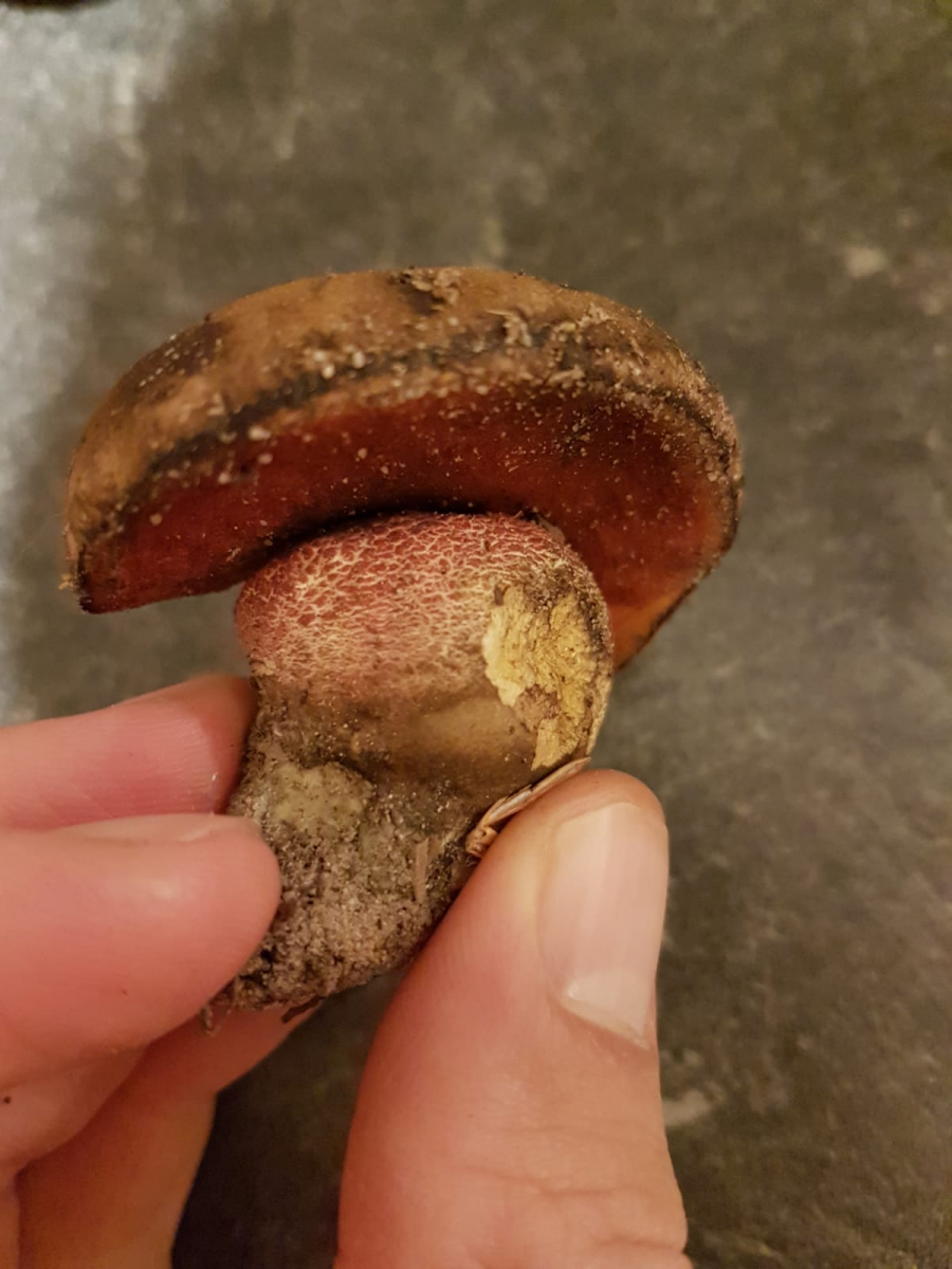 2. Ich vermute einen Flockenstieligen Hexenröhrling. Rote Röhren, Blaut beim Anschnitt, Hutfarbe und kein Netz zu sehen. Ich habe auch noch einen etwas entwickelteren Pilz direkt daneben gefunden, siehe letztes Bild