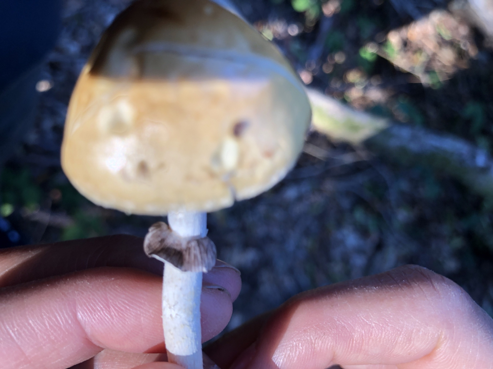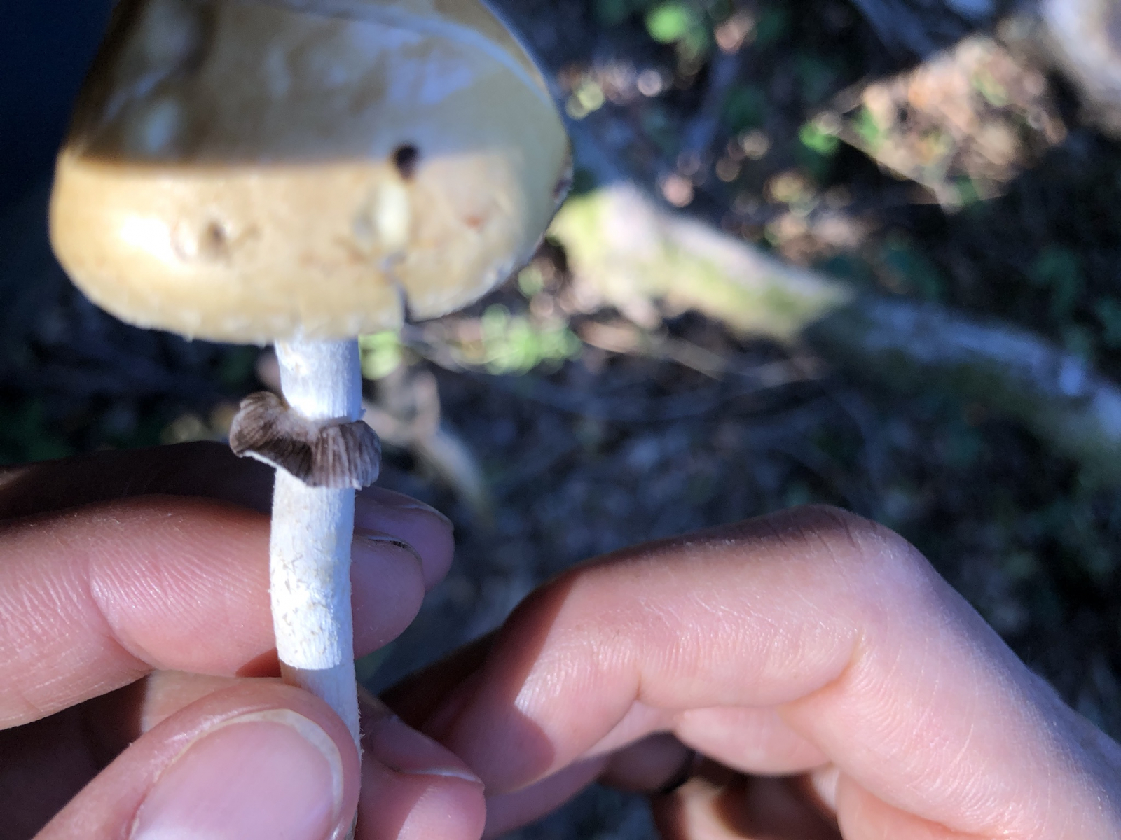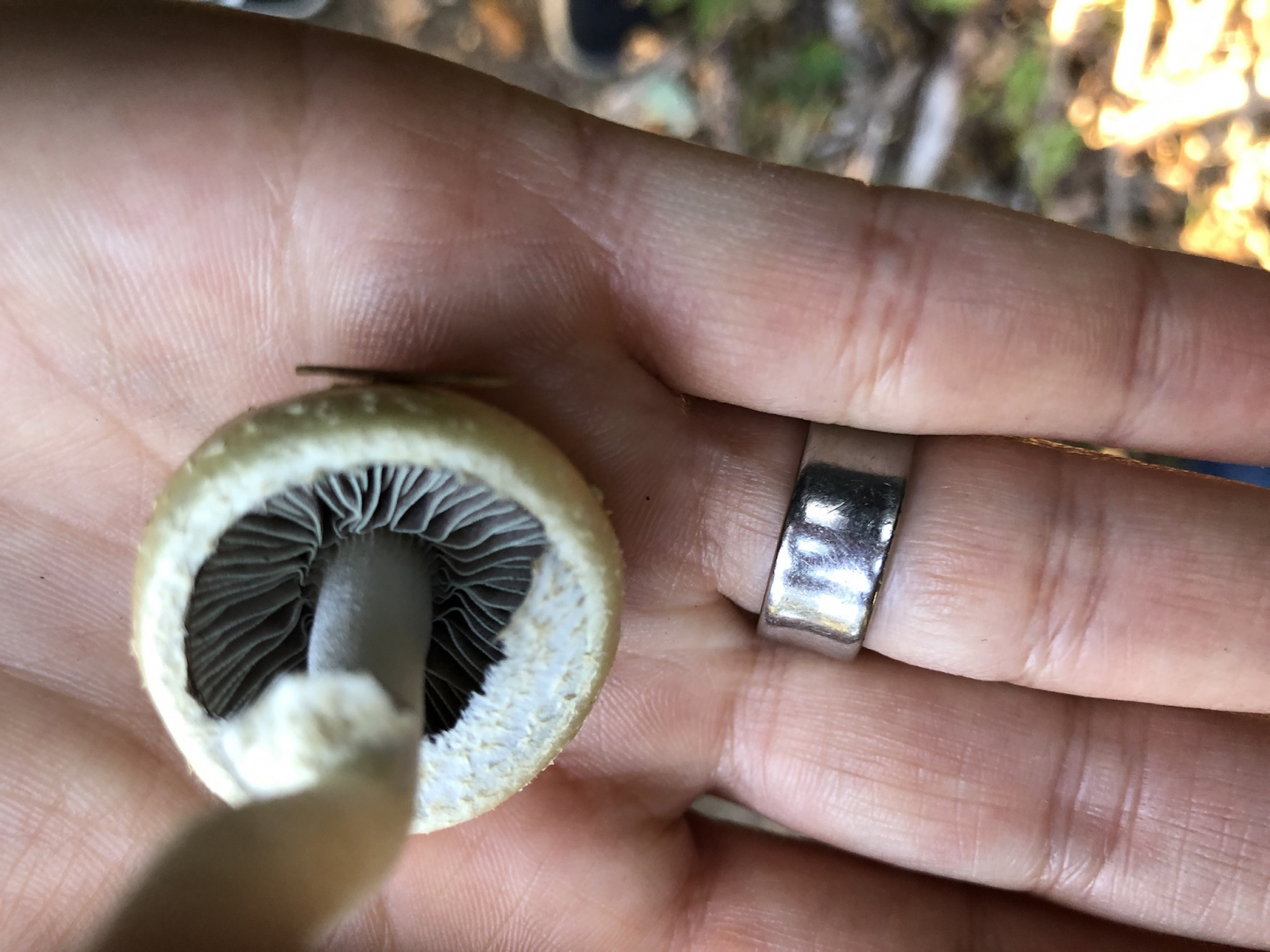 Hier sind die Lamellen von einer grauschwarzen Farbe überzogen, das passt eher zum schwarzbraunen oder violettschwarzen Sporenpulver diverser Träuschlinge. Auch das Sporenpulver auf dem Ring erscheint mir nocht rein braun, sondern eher dunkelbraun mit einem feinen violettschimmer. Dann wären da Schuppen auf dem Hut (wenn auch etwas unscharf), das machen Ackerlinge in der Regel auch nicht.