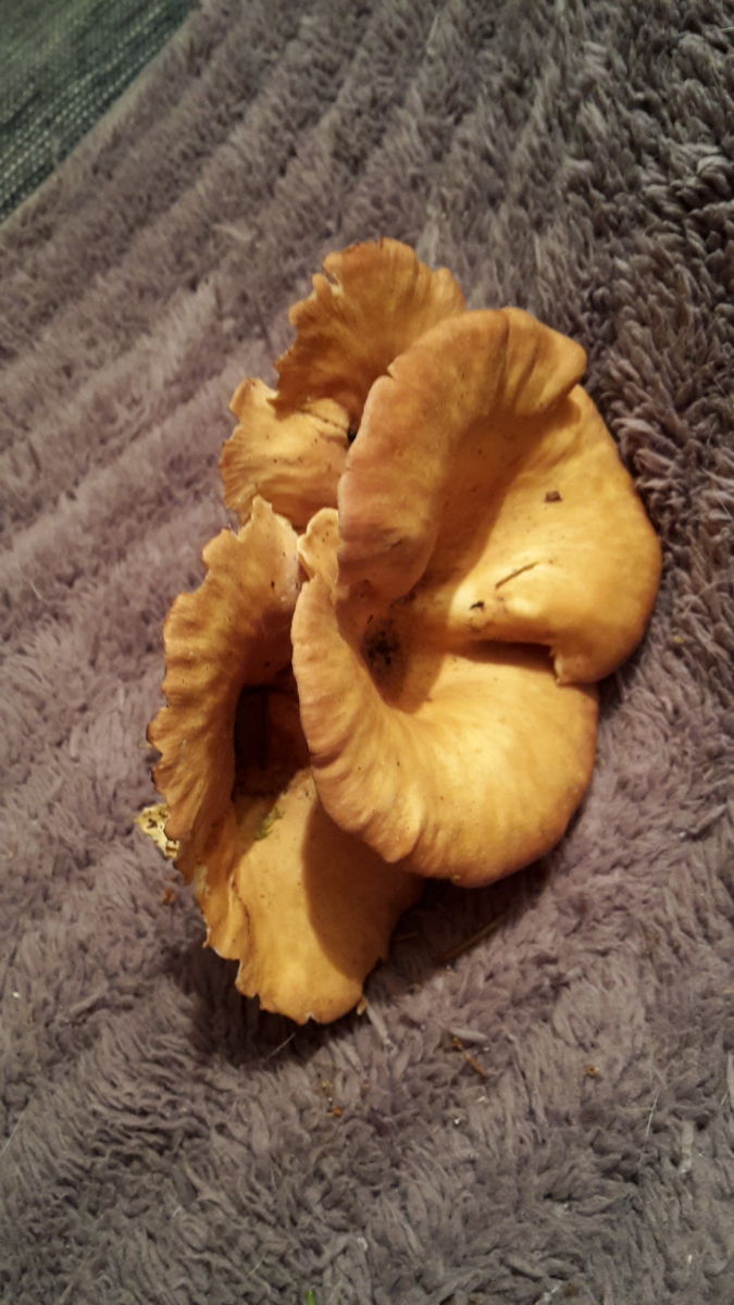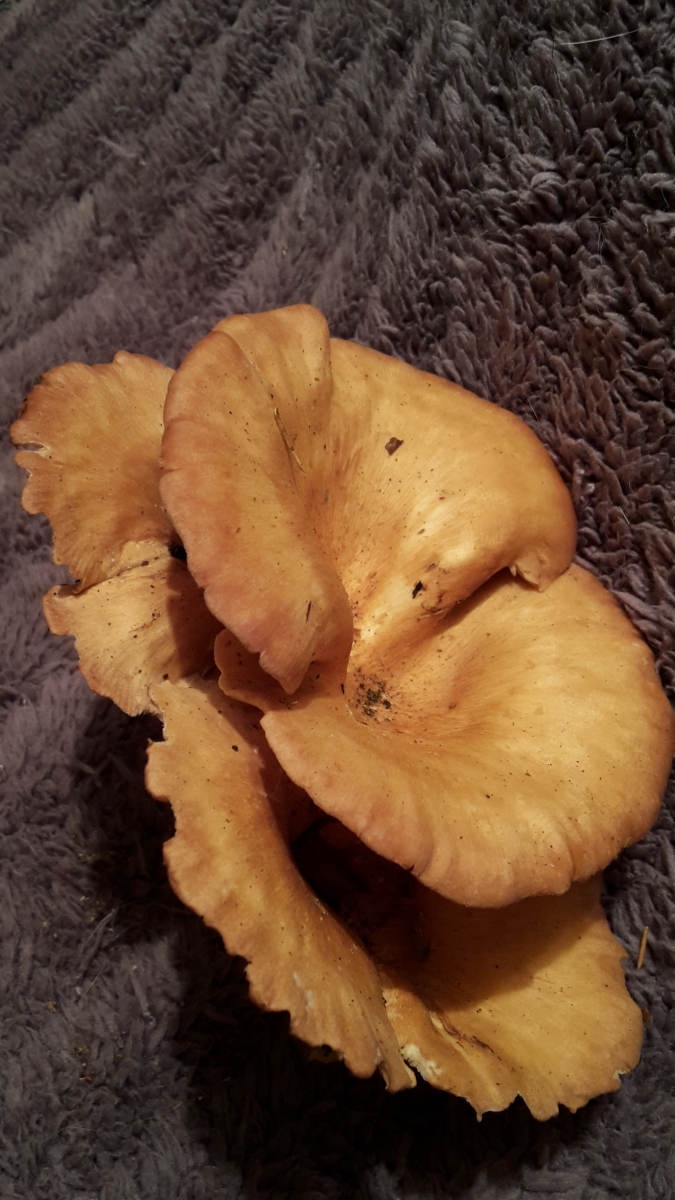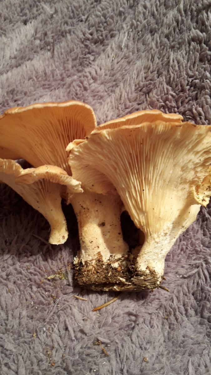 Bei diese Form und Farbe passt nur alte Lepista flacida , ich habe keine bessere Idee . Diese ungewöhnliche Farbe habe bei L. flacida nach Nebel und kalte Nachte gesehen . An Bild 2 ist Fichtennadel zu sehen , das bedeute das auch in Emmas Kiefernwald gibt Fichte . Meine das etwas auch um falsche Verfärbung bei Fotografieren gehet . Beschriebene Substrat ist etwas für diese Pilz ungewöhnlich .@ Emma , wie schaut Wachsort - Substrat ? Ein Stamm oder liegende baum ? Hat oben erde ?