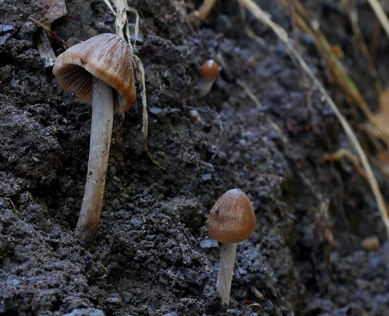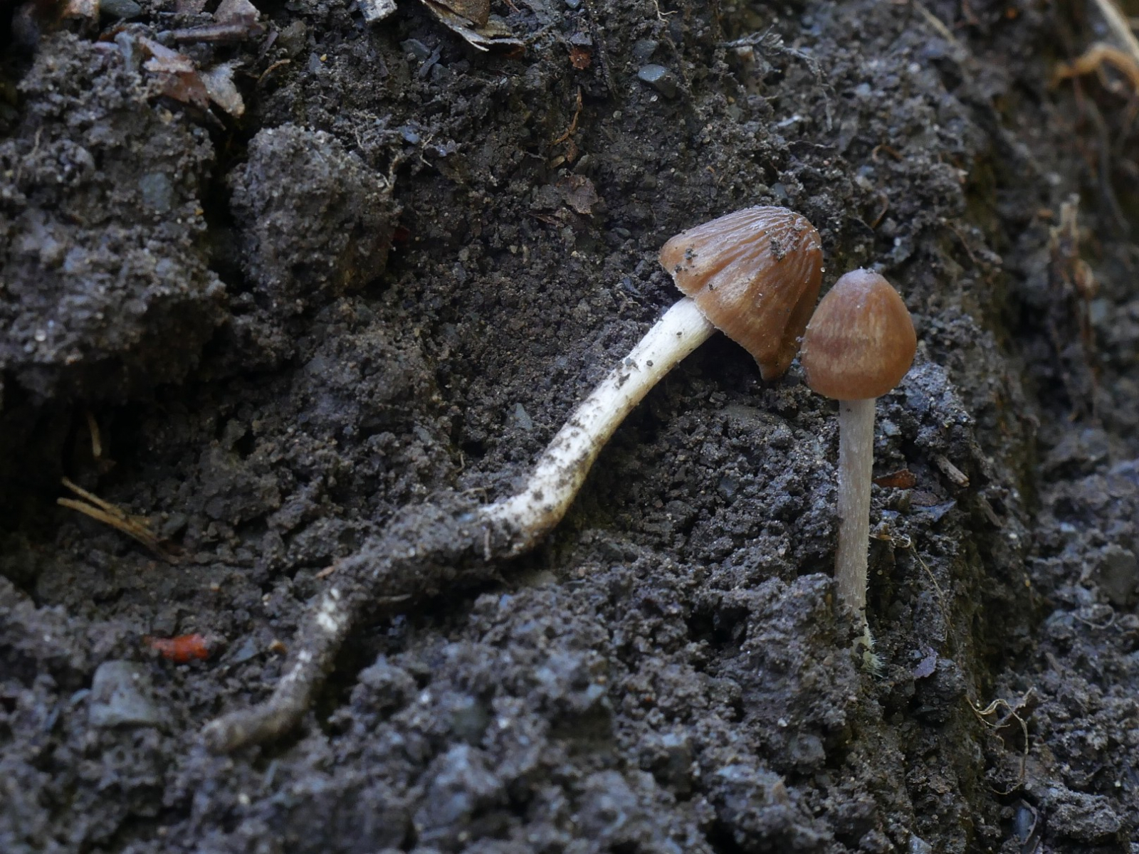 als ich kürzlich mal wieder einen Waldweg entlangkroch, fielen mir diese kleinen Gesellen auf. Kleine braune Pilzchen ignoriere ich normalerweise, aber hier hab ich aus Reflex mal dran gezupft. Erstaunlicherweise kam eine sehr lange Wurzel zu Tage. Den zweiten hab ich dann ausgegraben und konnte feststellen, dass die Wurzeln zusammengewachsen waren, resp. beide Fruchtkörper einer Wurzel entsprangen. In diesen Gattungen ungeübt hat es etwas gedauert bis ich auf Psathyrella kam. Und da hört es dann für mich auch schon auf.