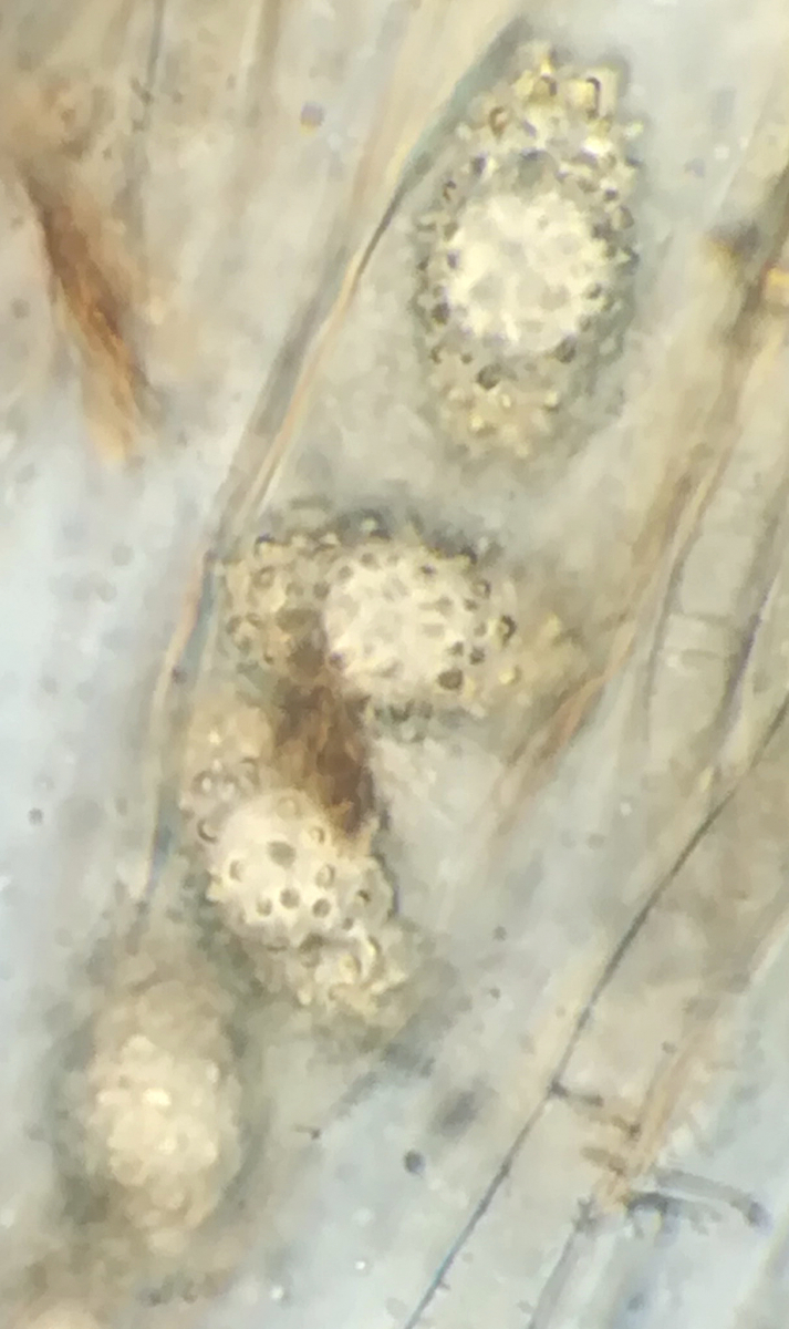 Das Fleisch/ Medula war das eine Textura globulosa/angularis ( also rundlich-eckige Zellen) oder waren das ( so wie es aussieht) aufgeblasene Hyphen/ Textura intricata ( durchs alter +Frost).