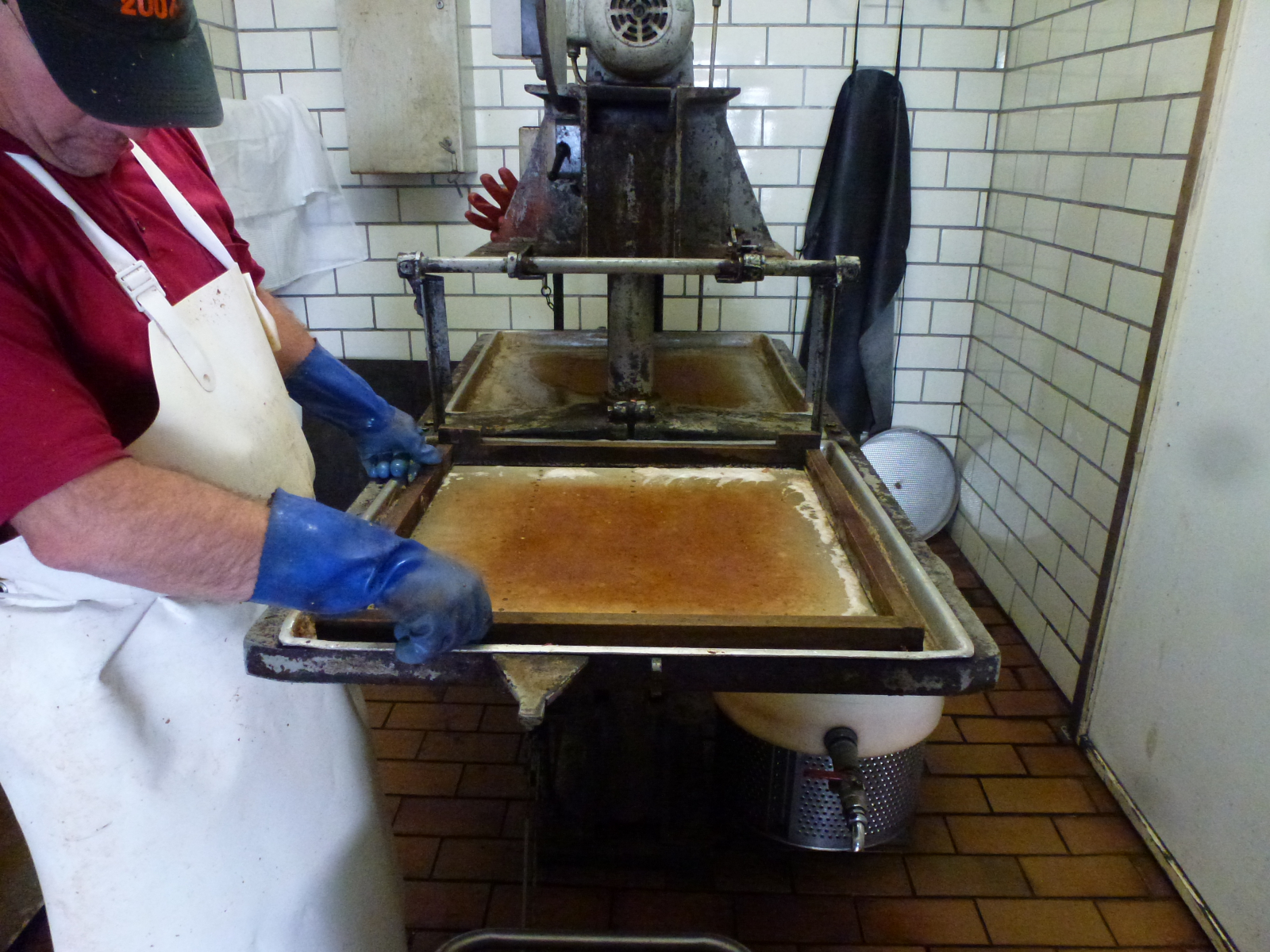 Jetzt gibt's "Luft auf's Kerrnche", die alte Maschine ächzt und baut Druck auf, um die Schichten auszupressen.