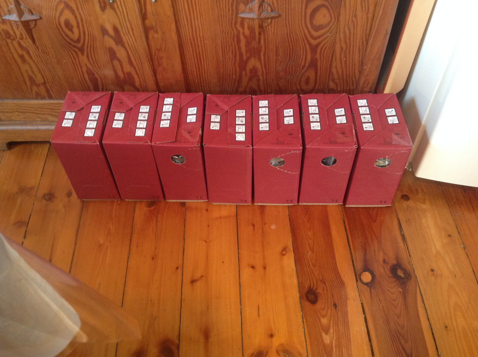 Jetzt geht die Verarbeitung zu hause los: umfüllen in den Sterilisiertopf, erhitzen und schließlich abfüllen in die Bag-in-Boxes. Es waren am Schluss 25 3-Liter-Boxen.