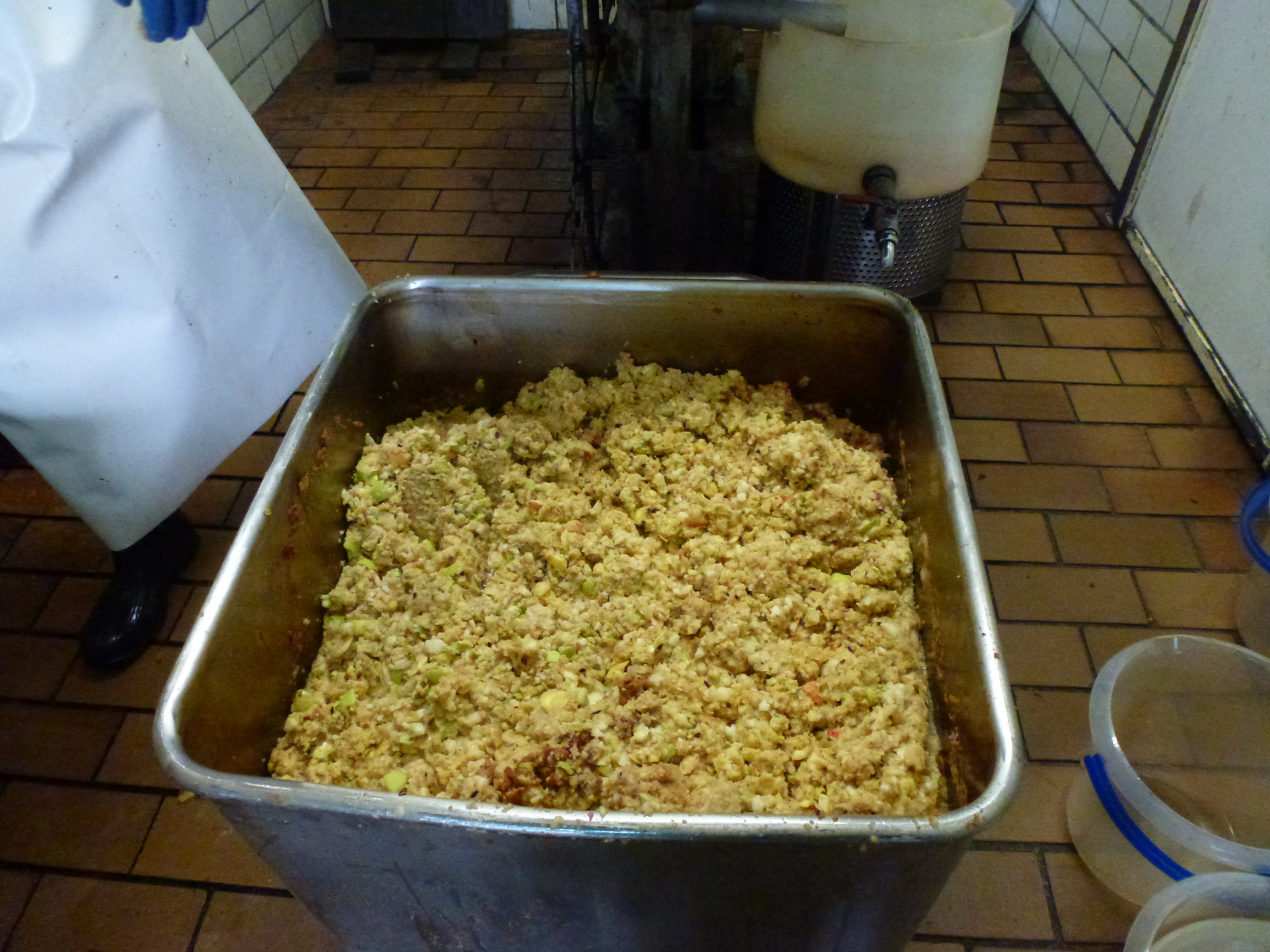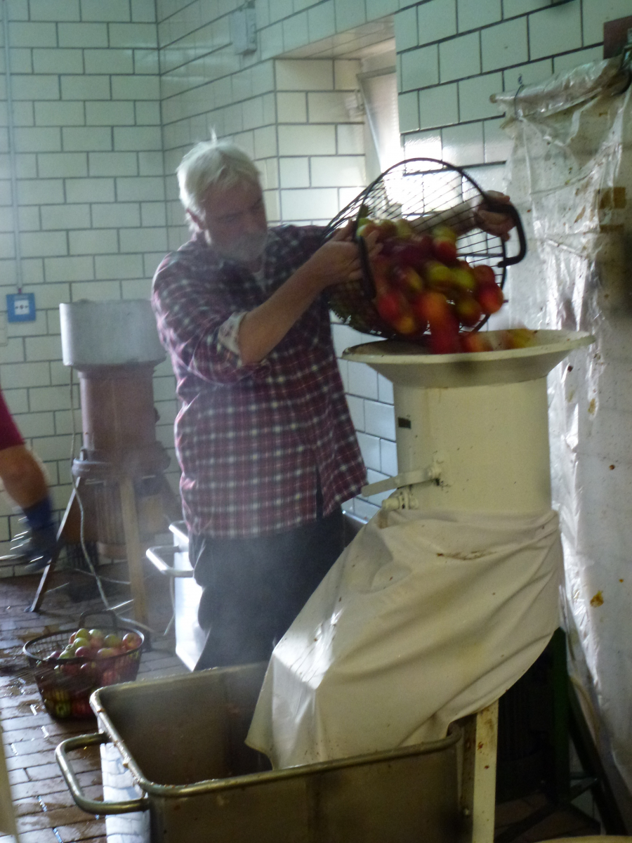 Hier ein paar Bilder in der Kelter. Der "Staub", den Ihr hier seht ist quasi pulverisierter Apfel der entsteht, während die Äpfel für die Presse geschreddert werden, man atmet also pures Apfelaroma ein.