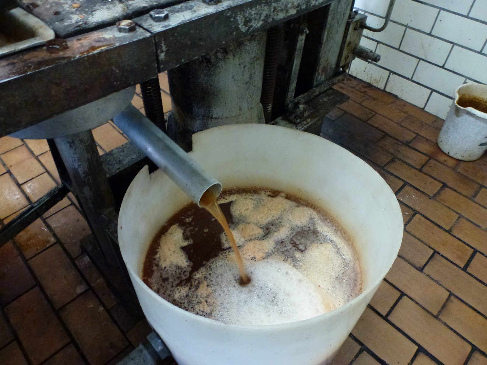 Dann, heute um 10:30 Uhr hatten wir einen Termin in unserer uralten Kelter. Dieses altertümliche Gerät wurde in den 50er Jahren mittels Crowdfunding von den Mitgliedern des heimischen OGV angeschafft, eine tolle Sache. Sie wurde schon diverse Male repariert, aber noch tut sie ihren Dienst, und das sollte man unterstützen.
