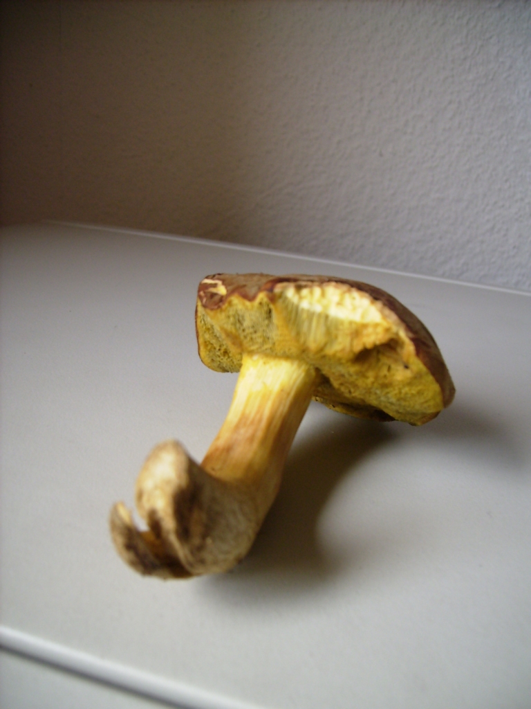 Nr. 1 = Ziegenlippe? 10 cm groß, wuchs aus dem Moos heraus, filzige, trockne braune Kappe, große gelb-grünliche Röhren, angenehmer Geruch.
