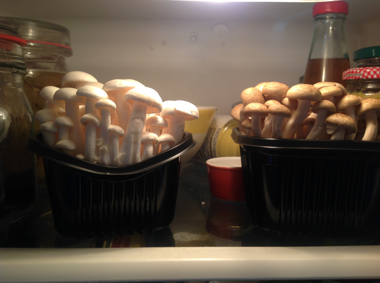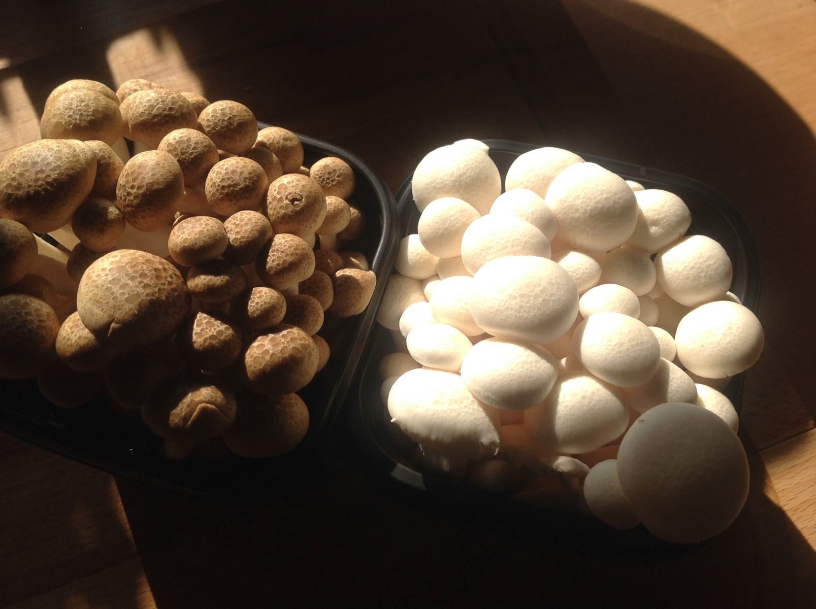 Da es bei uns immer noch keine Besserung gibt und ich schon auf die Apfelverarbeitung umgestiegen bin, habe ich heute im Supermarkt diese Pilze aus Südkorea gefunden. Buchenpilz weiß und Buchenpilz braun. Shimeji aus Südkorea steht drauf. Ich hab natürlich mal gegoogelt, ich glaube, die Pilze wurden hier auch schon mehrfach gezeigt: soll ein Rasling sein, Lyophyllum irgendwas...