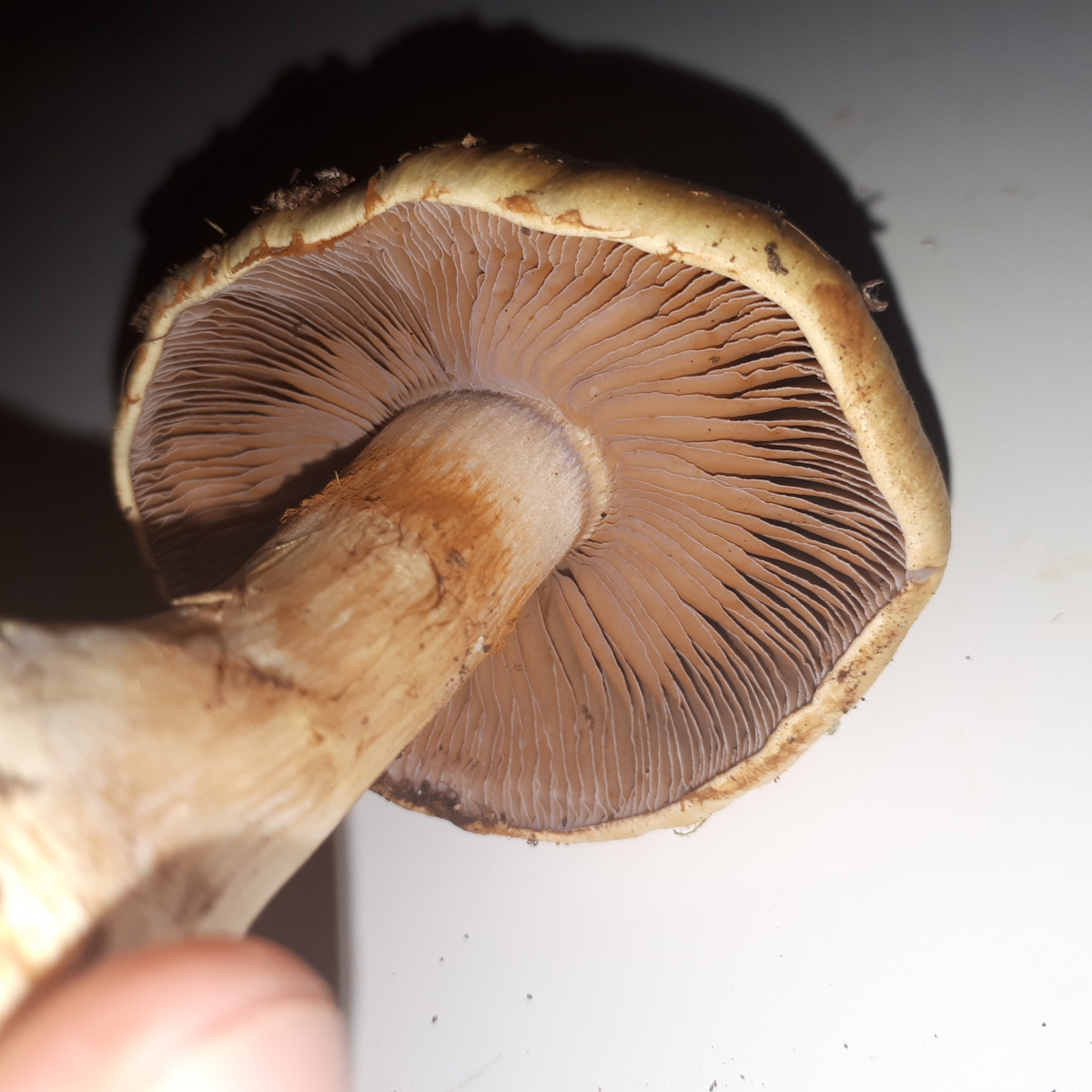 Das Lila Rändchen am Stiel sichert die Bestimmung ab, da die Lamellenfarbe bei alten Pilze kaum mehr zu erkennen ist.