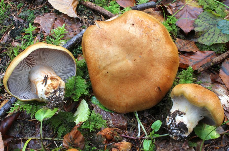Man sieht übrighens wunderschön das Velum universale auf dem ut (die Hüllreste). Zusammen mit den blauen Lamellen und den Hutfarben kann ein Spezialist sicher was dazu sagen - ich halte mich da zurück, weil ich bei den Phlegmacien i.w.S. den Anschluss verloren habe. Wenn, dann würde mir Cortinarius glaucopus i.w.S. einfallen.