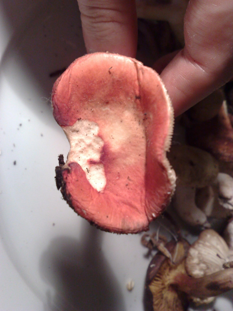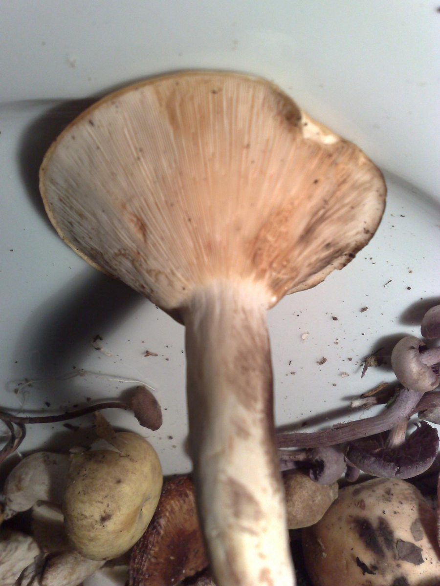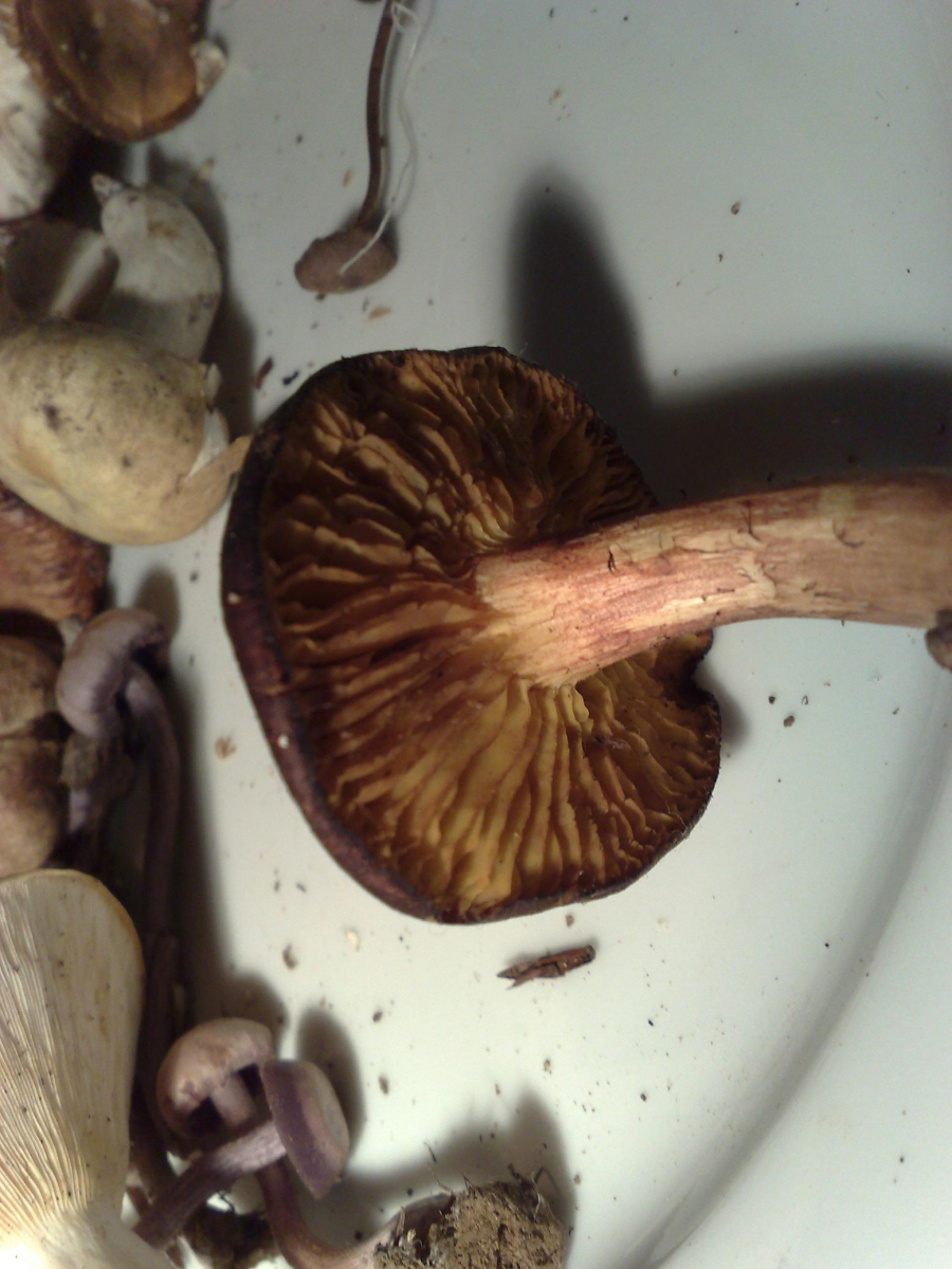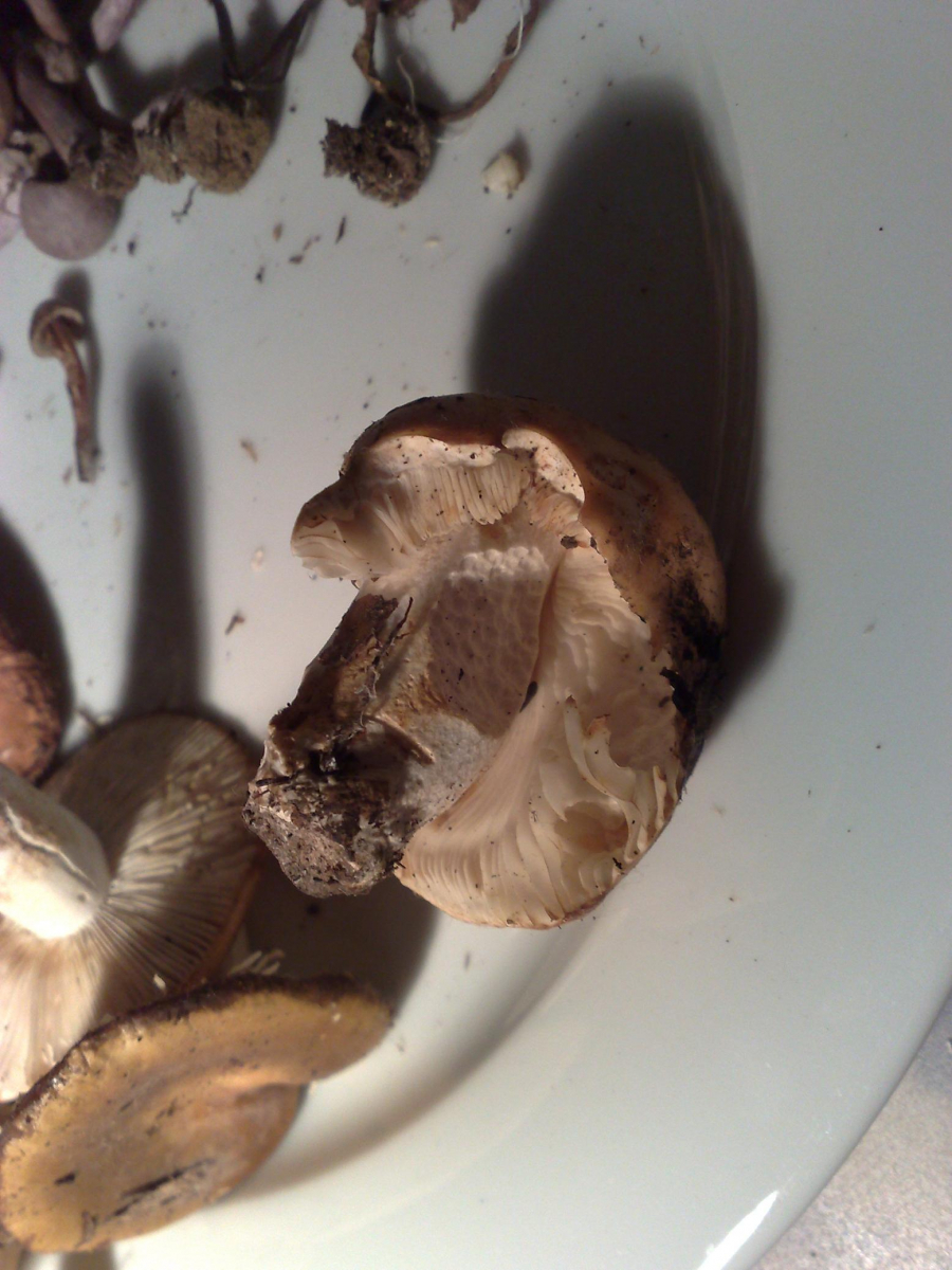 Bild 1+2 gehören zusammen. Ich nenne den Pilz mal Lebkuchen. Die Lamellen waren beim Pflücken noch weiss, haben sich dann aber verfärbt