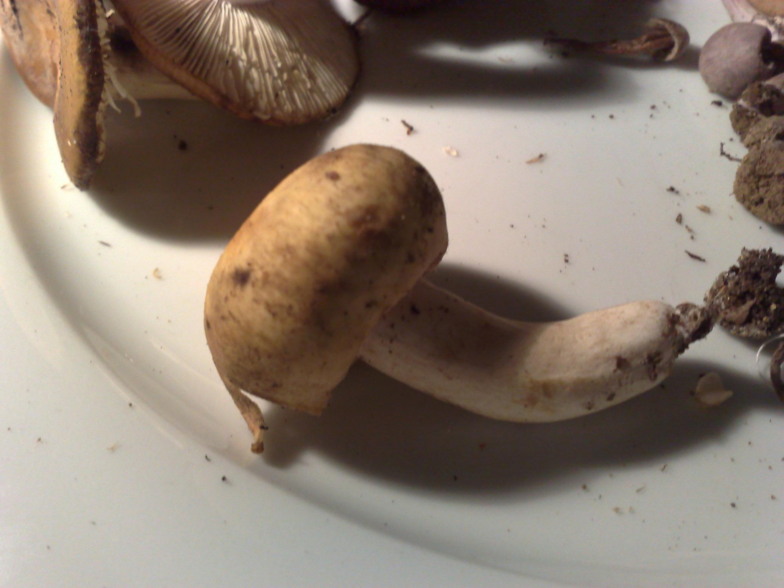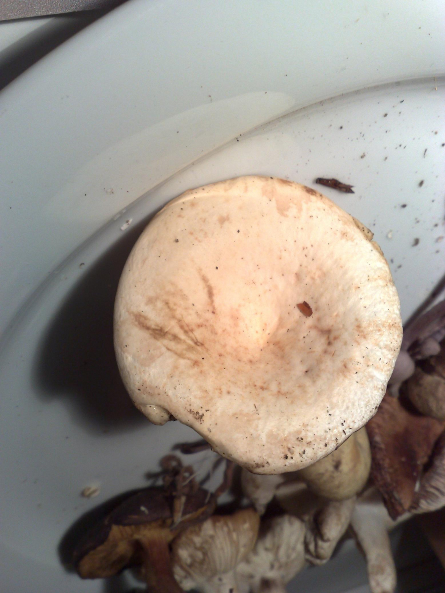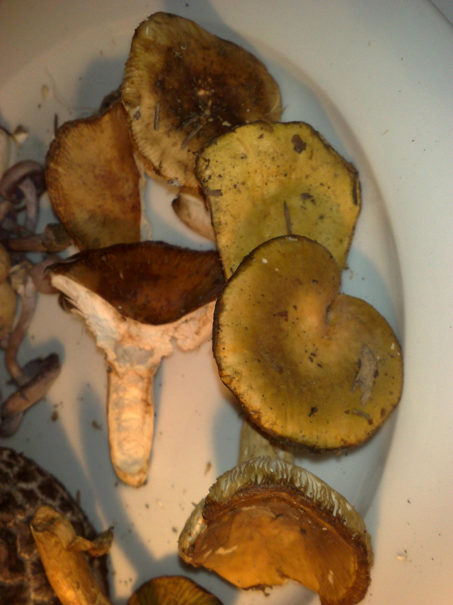 Bild 1+2 gehören zusammen. Ich nenne den Pilz mal Lebkuchen. Die Lamellen waren beim Pflücken noch weiss, haben sich dann aber verfärbt