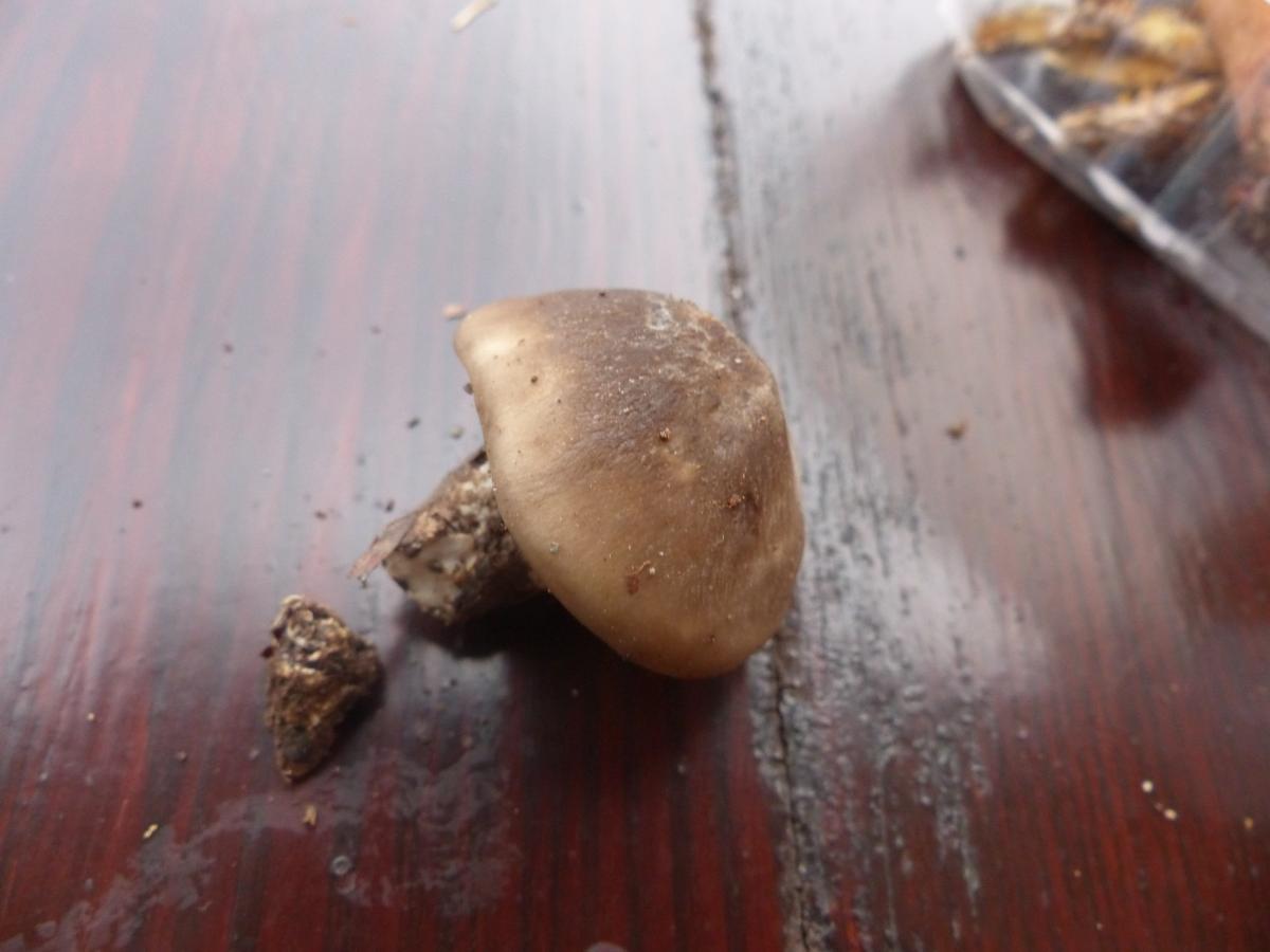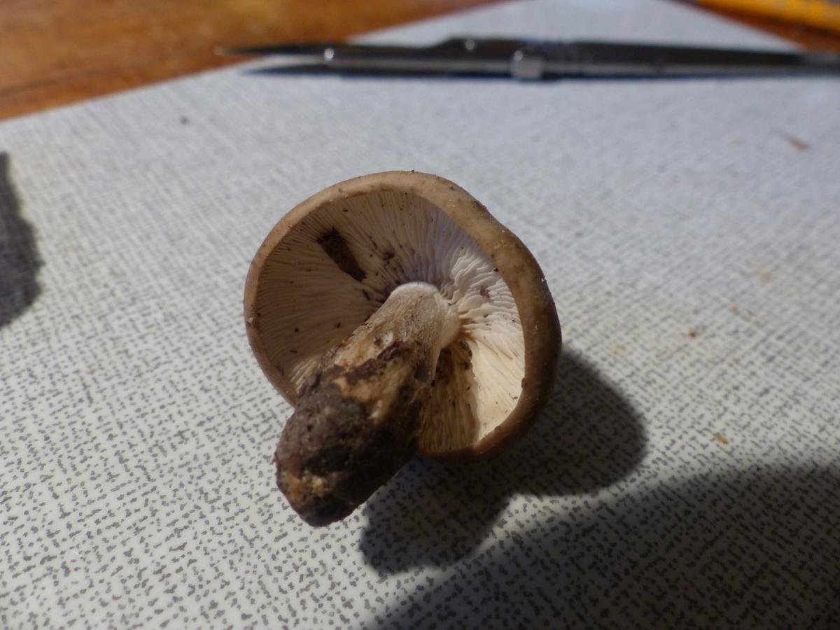 bei diesem Pilz komme ich nicht weiter. Er erinnert etwas an einen Erdritterling, allerdings ist die Farbe des Hutes eher bräunlich als gräulich und nur wenig faserig.