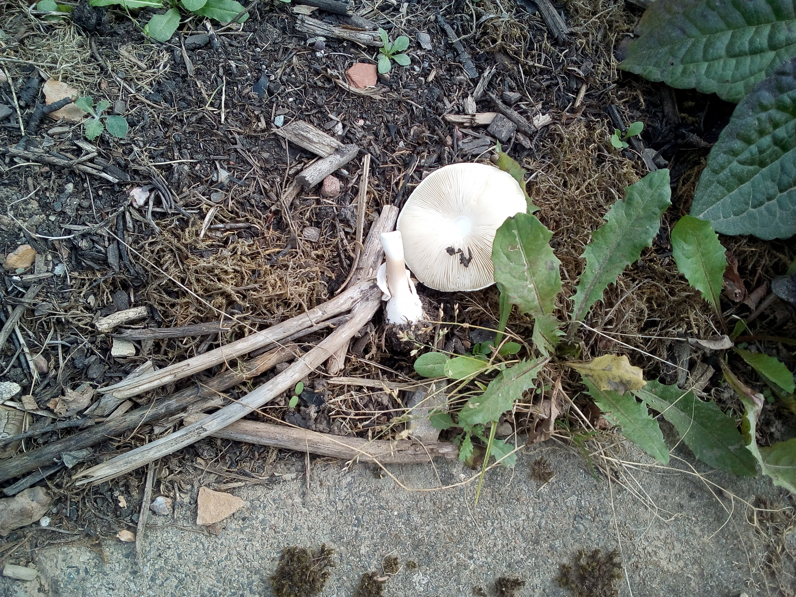 Also ich für meinen Teil sehe aus ziemlicher Entfernung einen abgebrochenen Pilzhut und einen abgebrochenen Pilzstiel mit keuliger Basis, beide augenscheinlich weiß. Außerdem sehe ich noch einen kleinen häutigen Velumlappen, bei dem nicht klar ist, woher er stammt bzw. wo genau er angewachsen ist/war. Also insgesamt schlechte Voraussetzungen für eine belastbare Benennung des Pilzes.