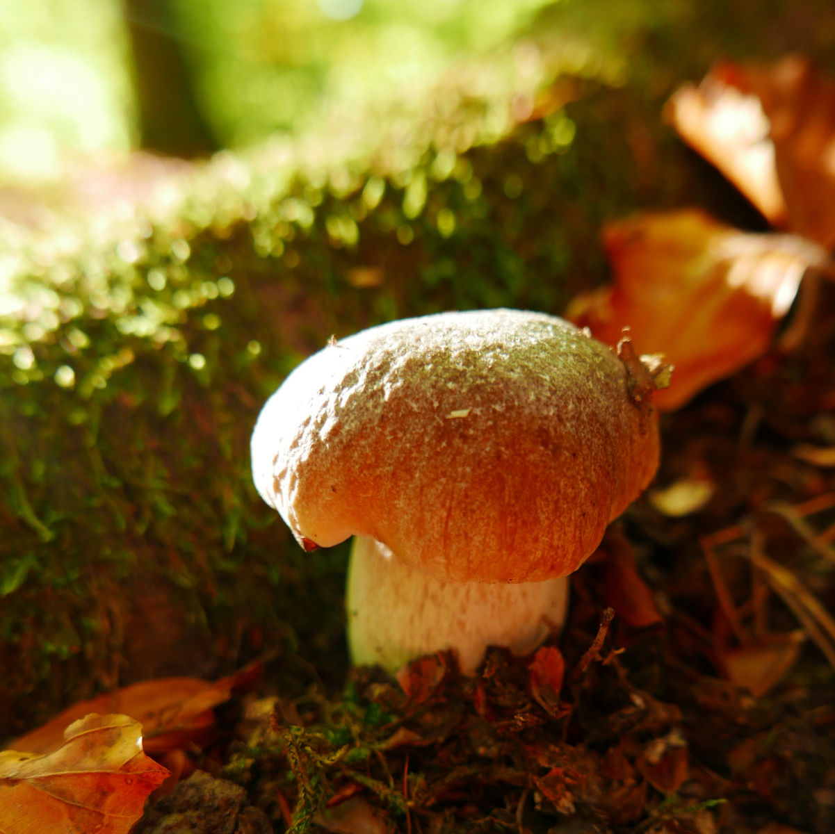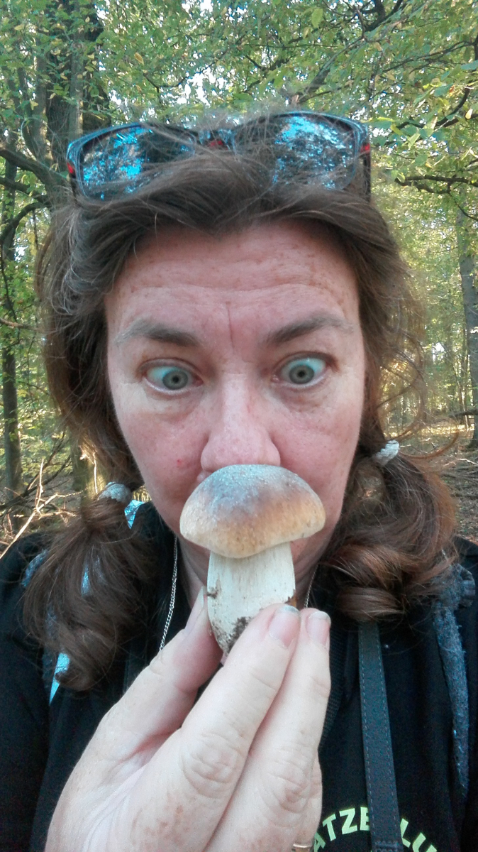 So, weiter im Wald, es.gibt ja noch ein bisschen was "abzuklappern". Im nächsten Waldstück schloss ich mein Fahrrad ab, ging zur nächsten Buche und begrüßte sie. Als ich dann an ihrem Stamm herunterblickte, stand direkt an ihrer Wurzel, ich konnte es gar nicht glauben, ein Steinpilz!