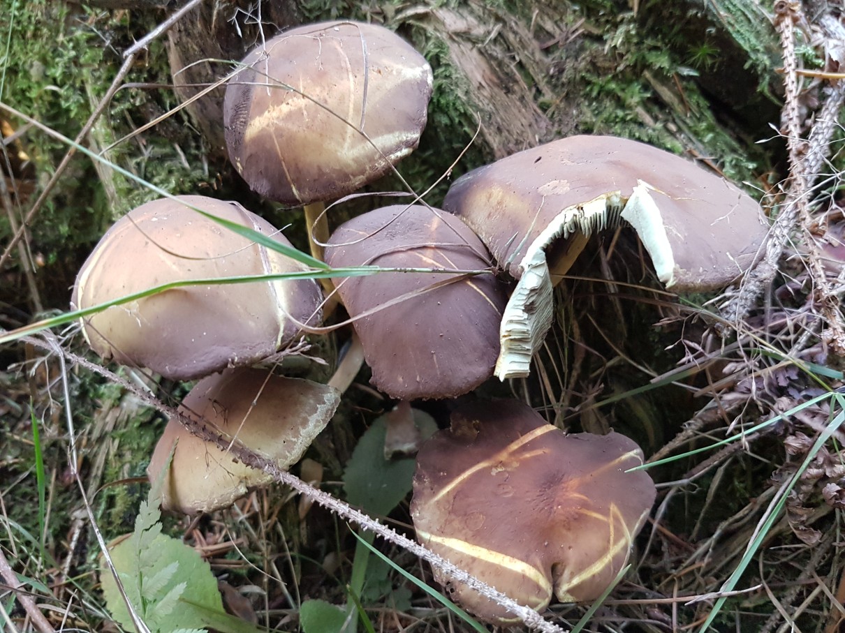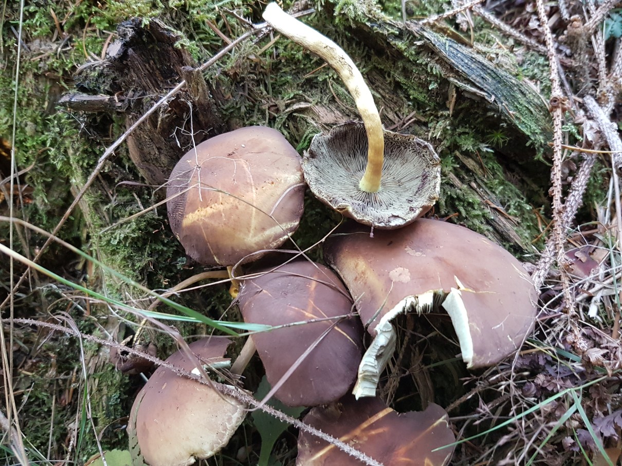 bei der Laccaria, gibt es da ein Foto von der Stielbasis? Falls die lila ist, wäre das Laccaria bicolor.