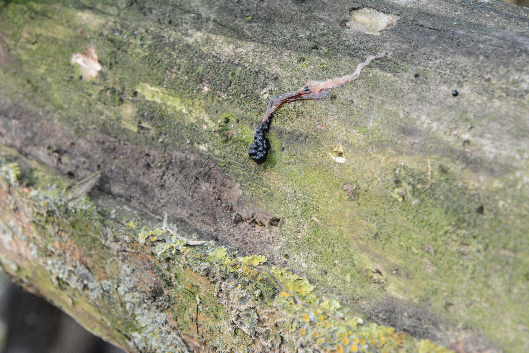 das kann sein, kann aber auch nicht sein. Das "Ding" zieht so eine Art Schleimspur hinter sich her. Ich vermute, es könnte sogenannter Sternenrotz/ Meteorgallert sein. Das sind von Greifvögeln unverdauliche Bestandteil, hauptsächlich von Fröschen u.a. Tierchen, die dann irgendwo aus dem Himmel fallen. Es gibt aber auch einen Schleimpilz. der ähnliche Fruchtkörper ausbildet, der Fadenfruchtschleimpilz, aber so einzeln tritt der eigentlich nicht auf.