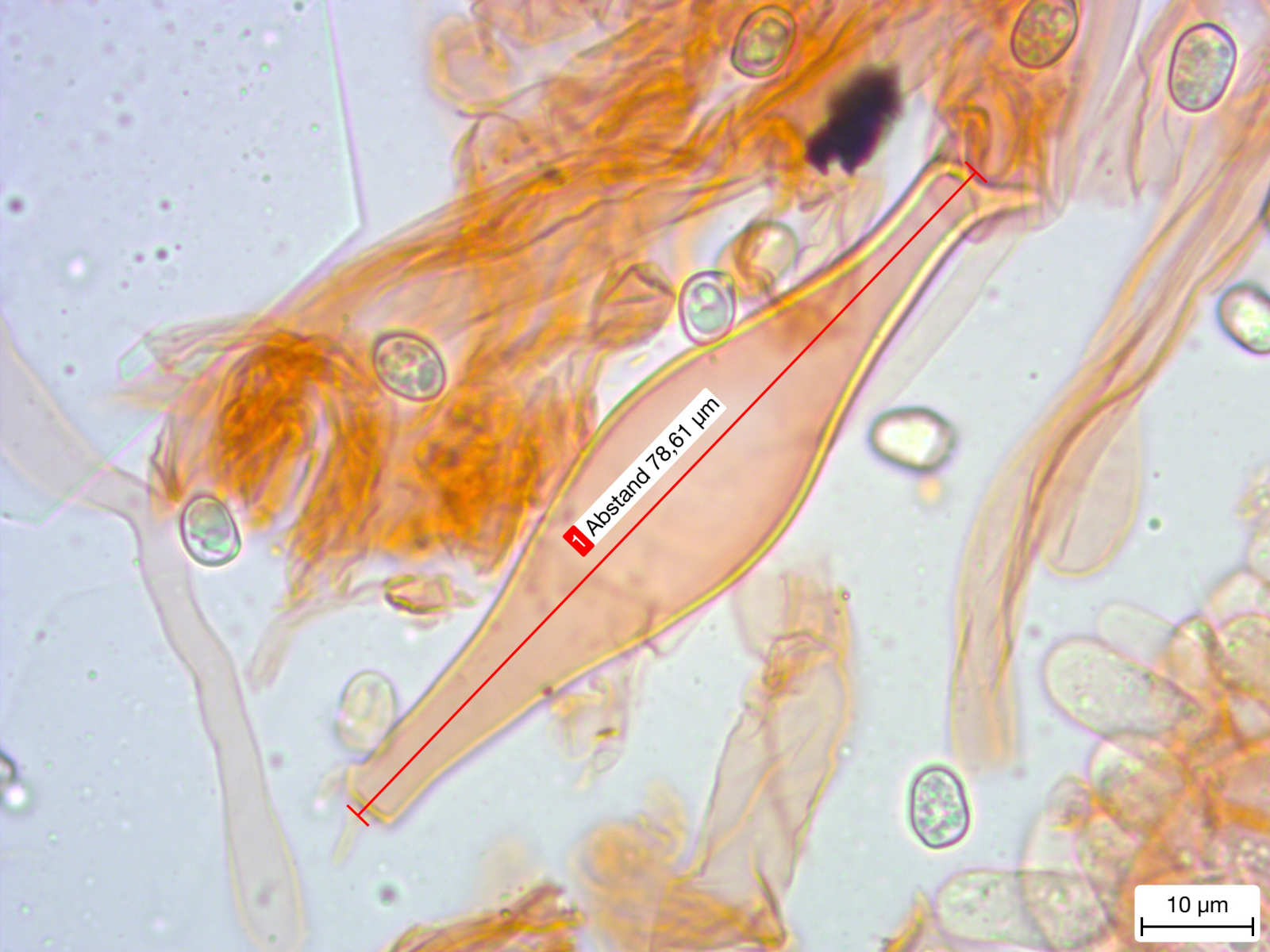 Das Innenleben des Pilzes zeigt sehr auffällige Zystiden mit vier Zipfeln.