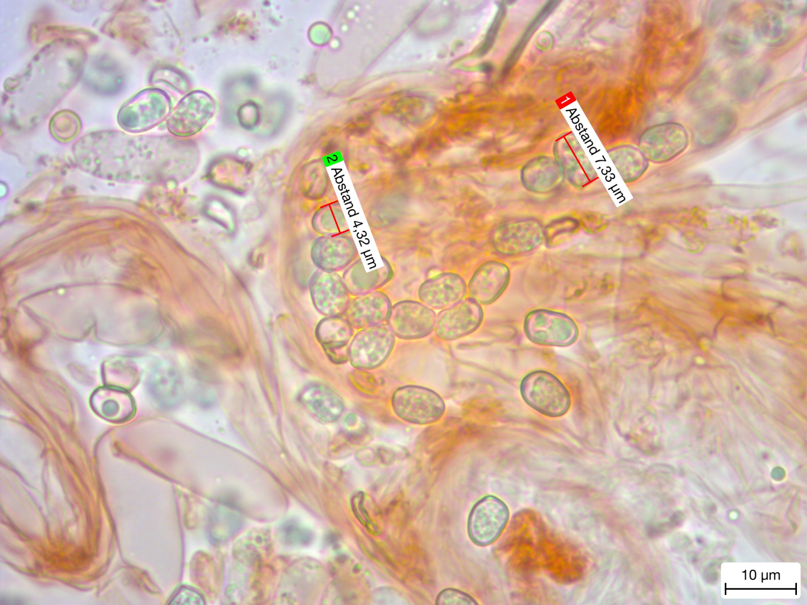 Das Innenleben des Pilzes zeigt sehr auffällige Zystiden mit vier Zipfeln.