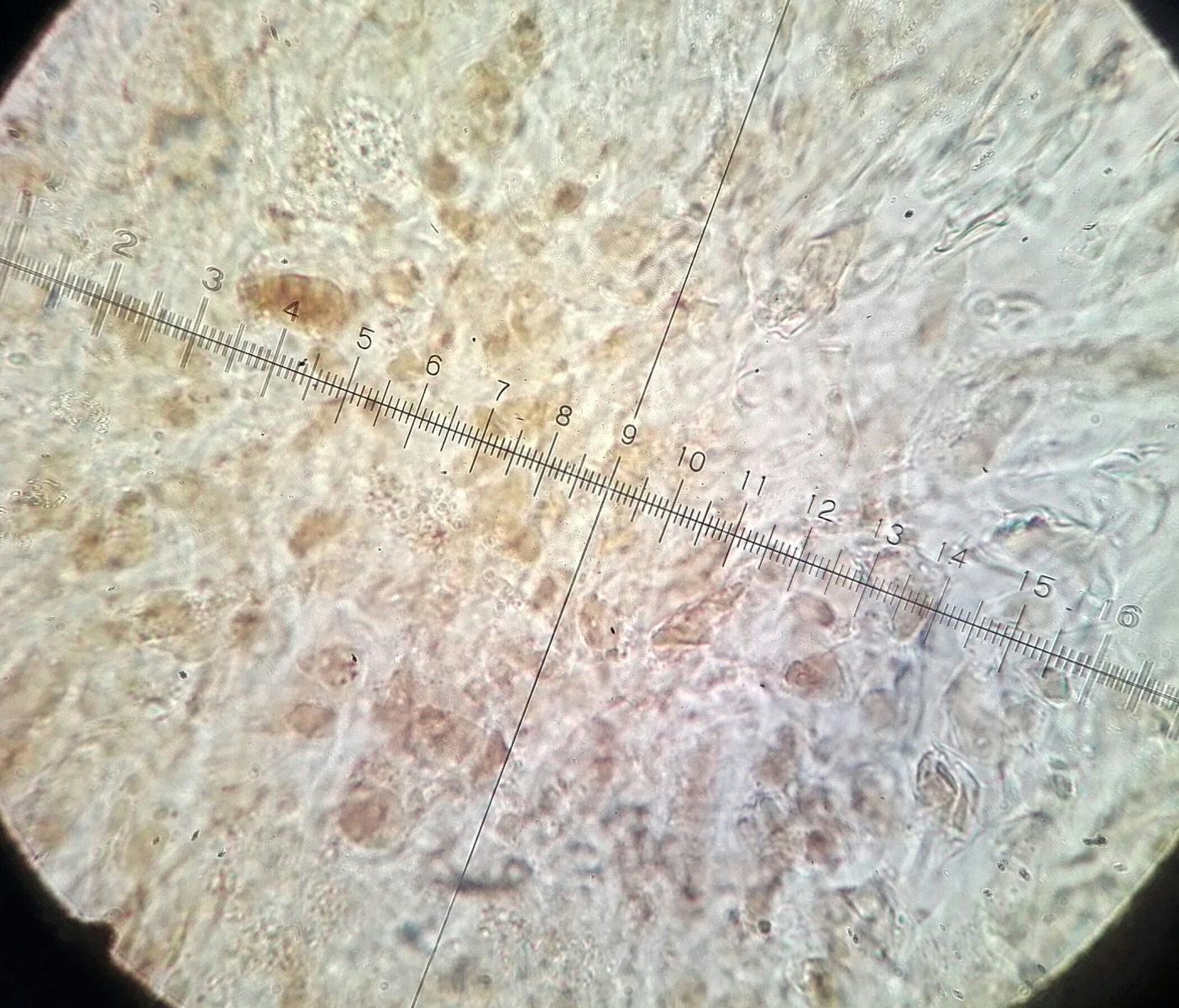 ich hab mir den Pilz grad genauer angesehen und Fotos gemacht. Die Sporen dürften passen, das mit der Huthaut hat glaub ich mal wieder nicht so gut funktioniert... Aber vielleicht könnt ihr ja dennoch erkennen, ob es Inkrustationen sind.