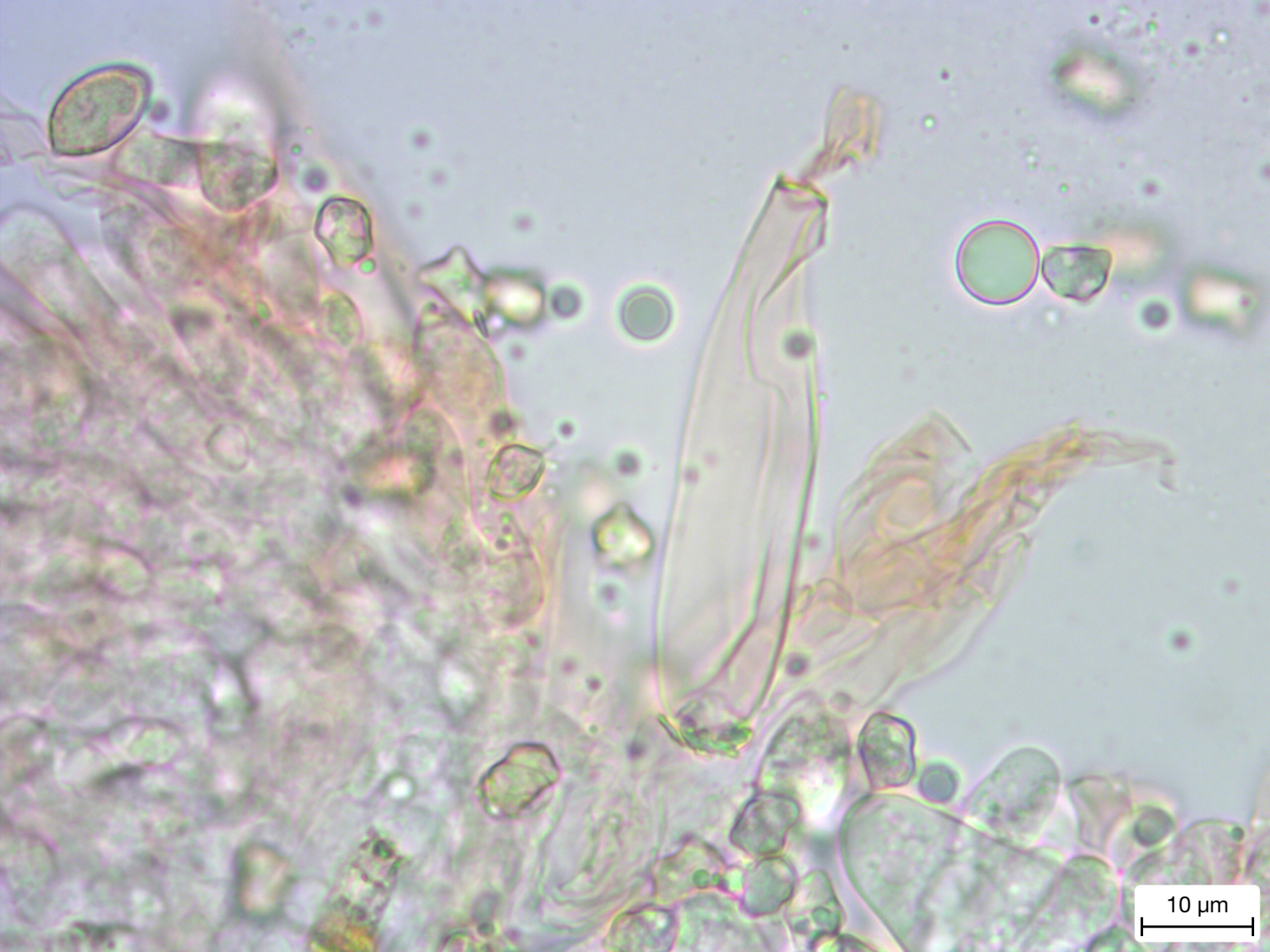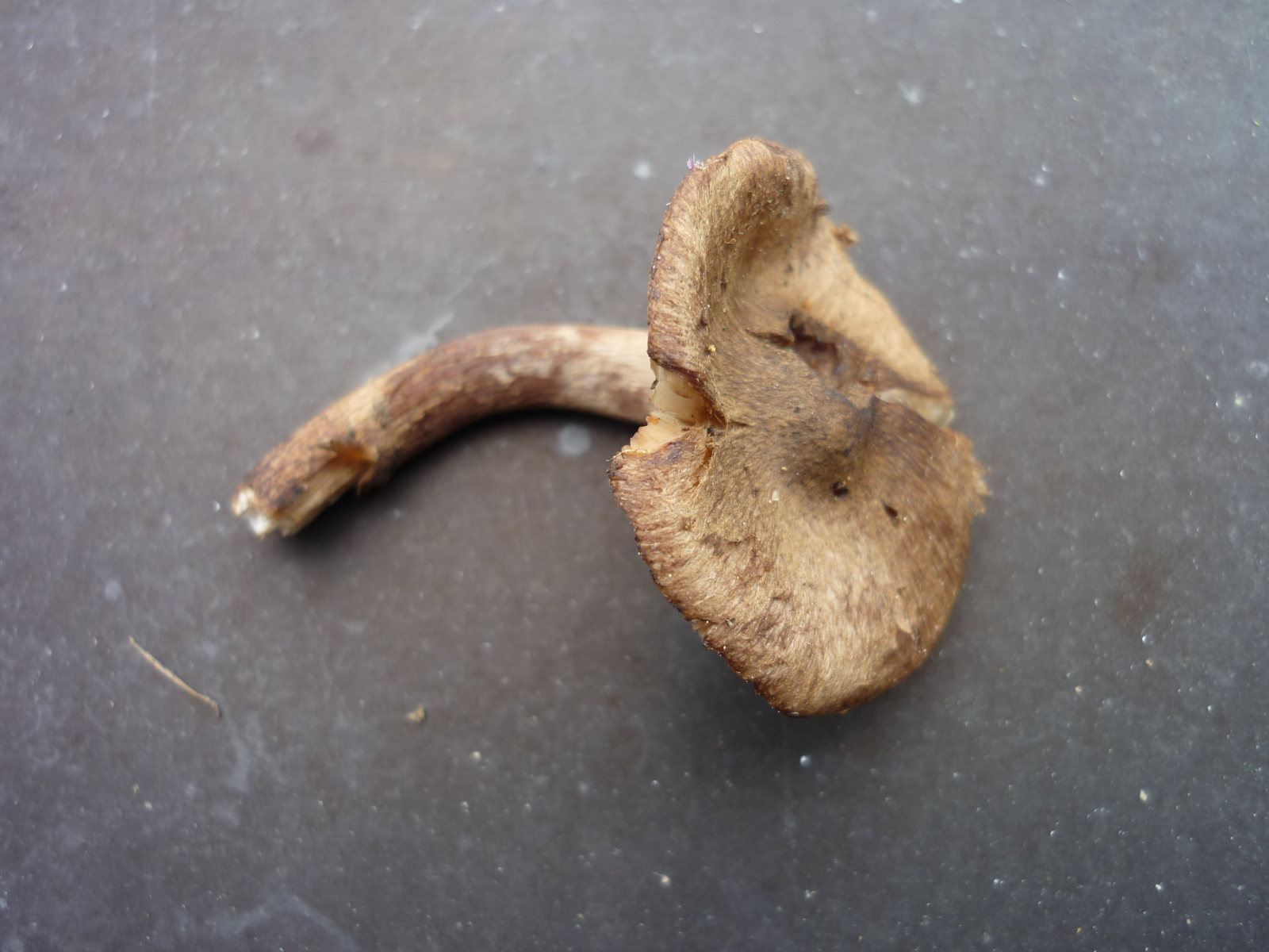 An Fichten, filzig-faserige Huthaut, knapp 3 cm Hutdurchmesser, Geruch nicht wahrnehmbar, Lamellen angewachsen, Fleisch cremeweiß, Zystiden mit flachem Kristallschopf, Sporen eckig. Kann das der Höckersporige Risspilz sein, obwohl ich kein Foto gefunden habe, dass ihm hundertprozentig ähnlich sieht?