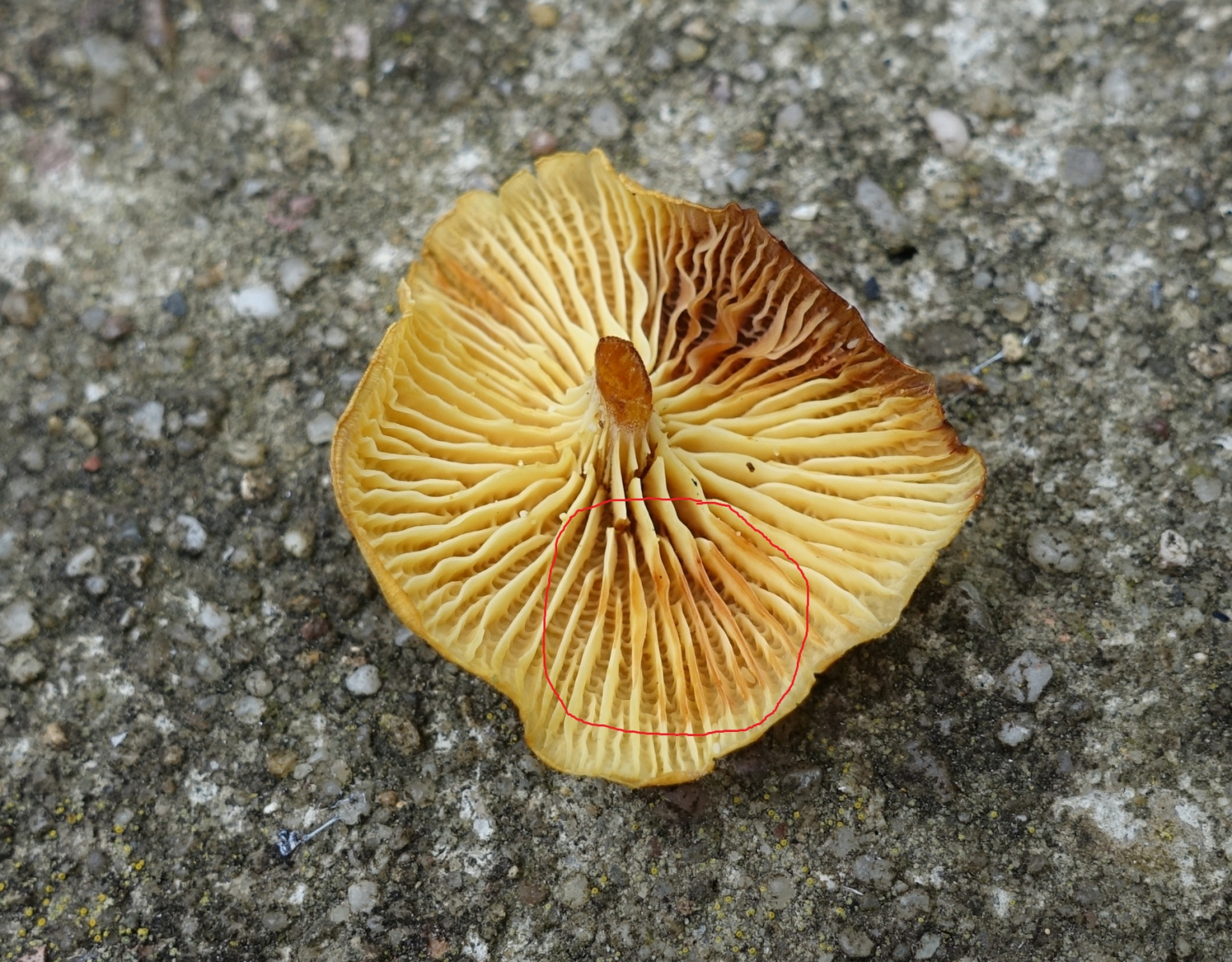 Hut flach, am Rand wellig verbogen. Huthaut etwas durchscheinend, am Rand deutlich gerieft außerdem am Hutrandheller als in der Mitte. Lamellen gelblich (wie der Hutrand) und leicht herablaufend; am Grund auffällig anastomosierend.