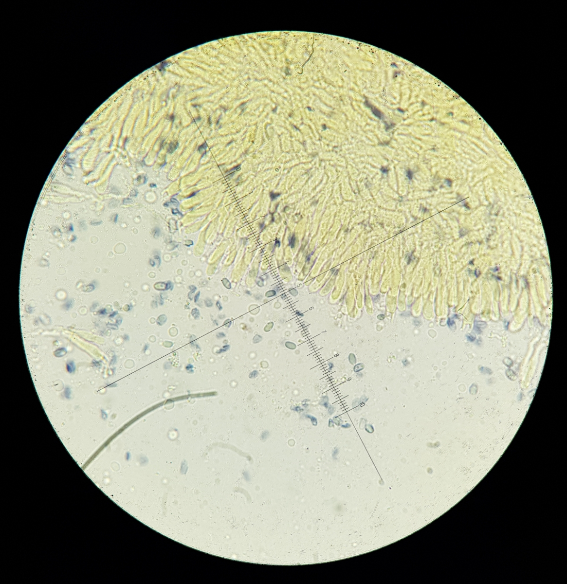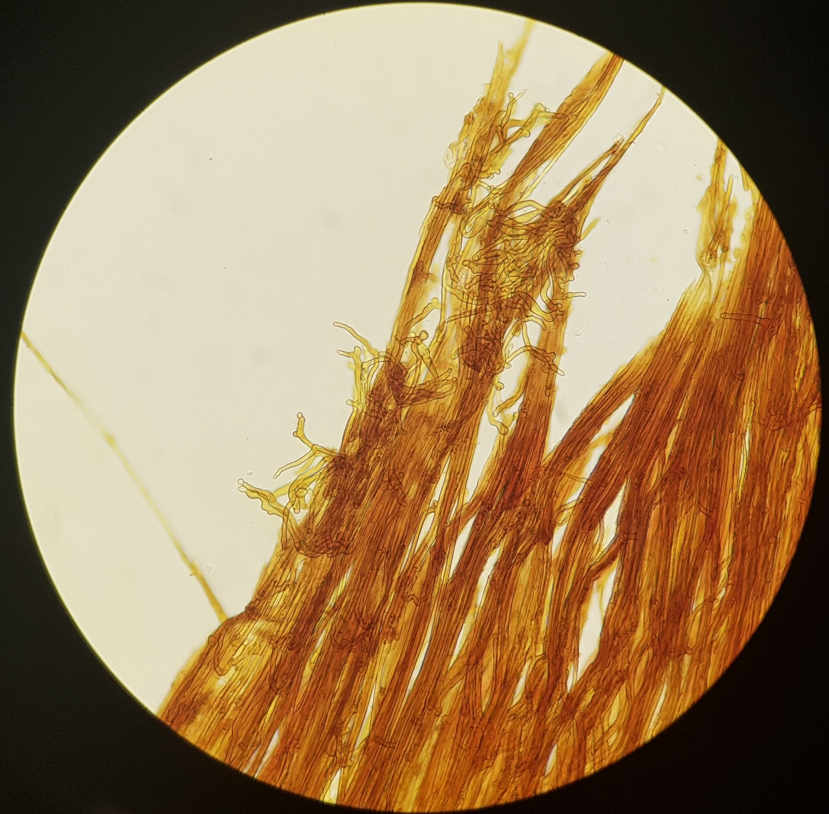 Der Stiel sehr dünn aber zäh, über die gesamte Länge braun und feinsamtig. Spp-Farbe muss leider ausfallen, der Pilz wollte über Nahct nichts preisgeben.