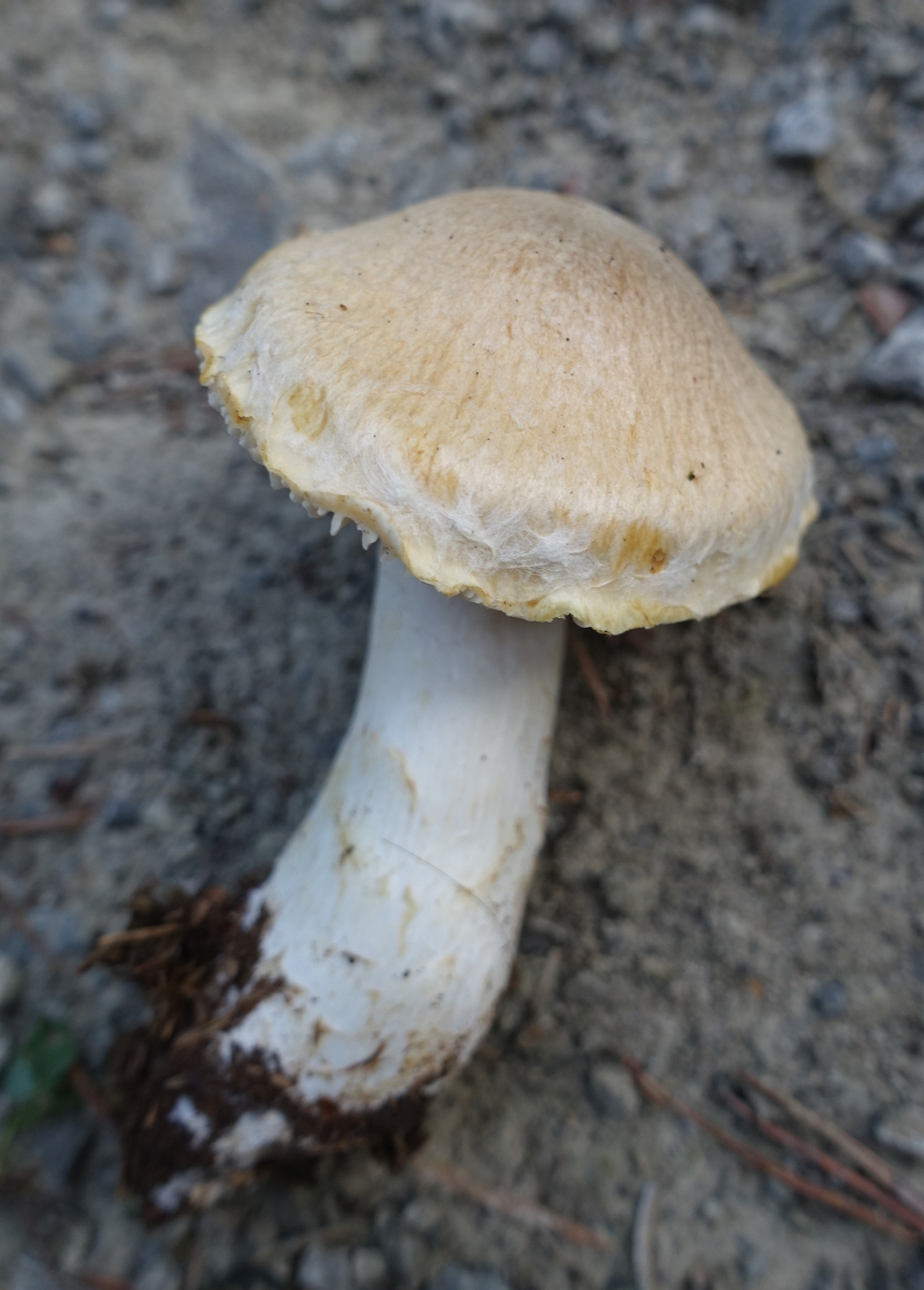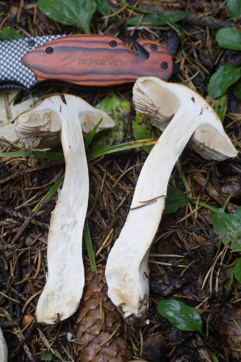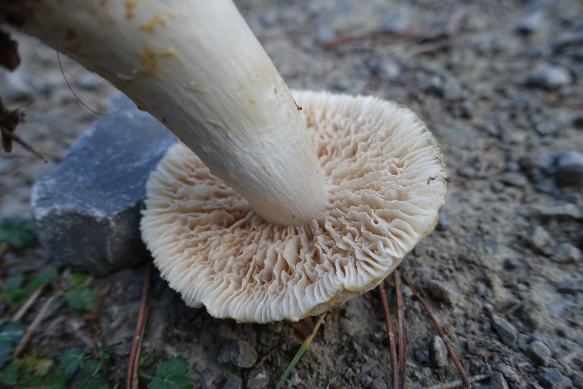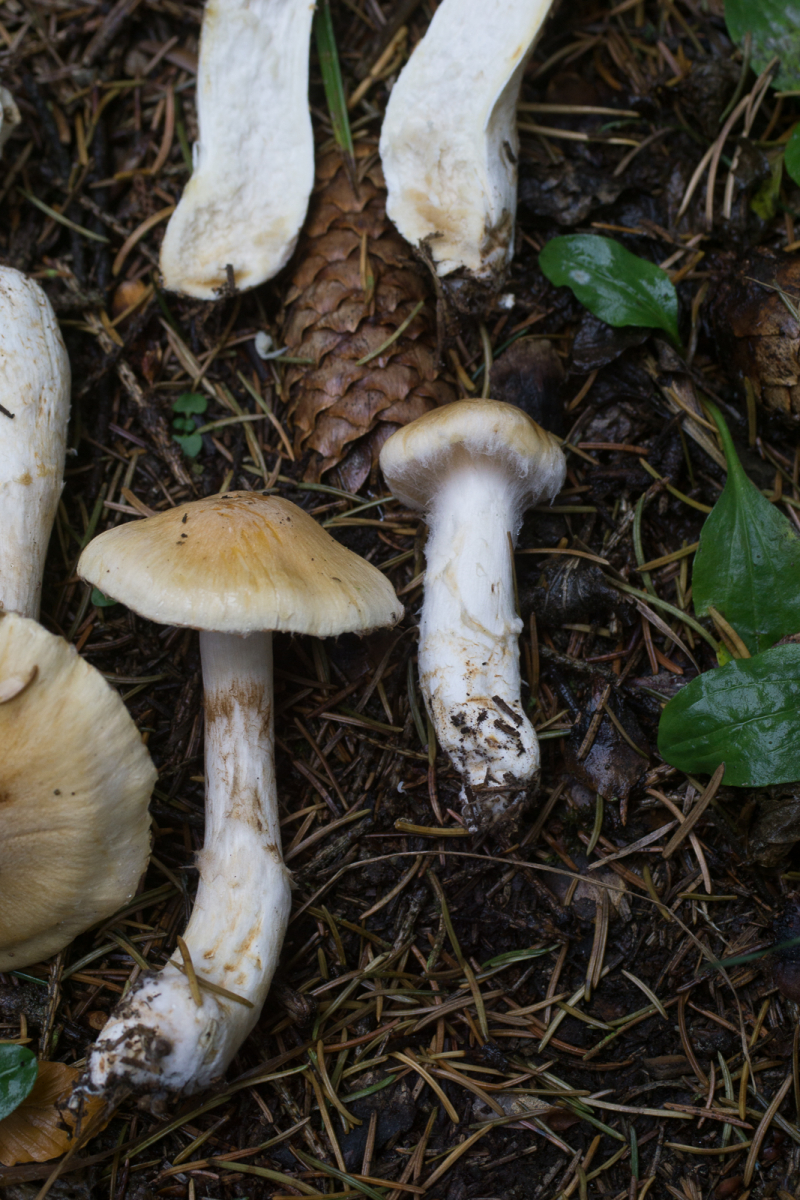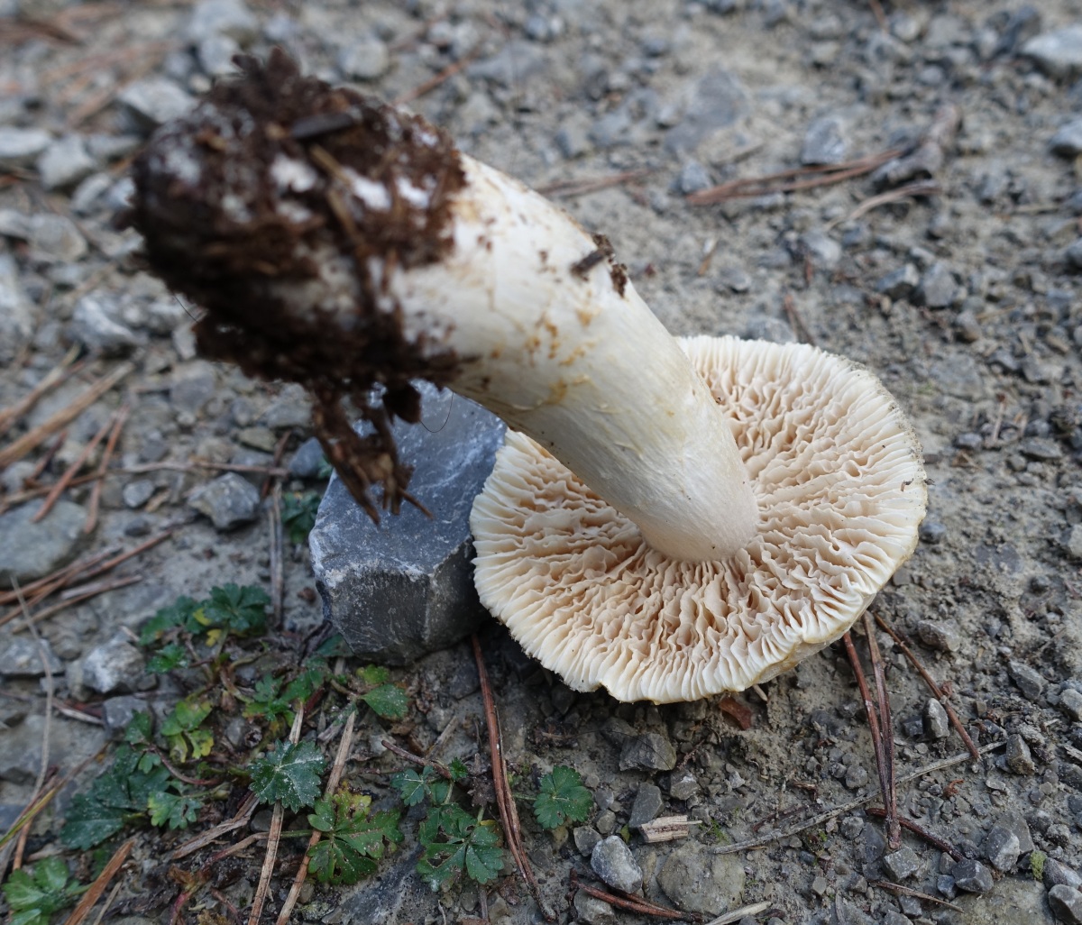 Fundort ist vermutlich der selbe wie in diesem Threas von Schupfnudel. Der ganze Habitus schreit nach Cortinarius, aber mit diesen derart hellen Lamellen? Ich war erst mal etwas ratlos. Leider war (einzige) Exemplar noch zu frisch, keinerlei Spp-Abwurf über Nacht. Und auch kein Spp welches sich in der ev. vorhandenen Gespinst am Stiel hätte verfangen können.