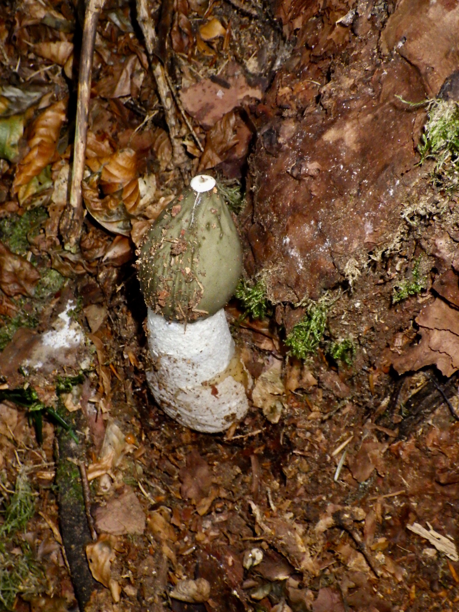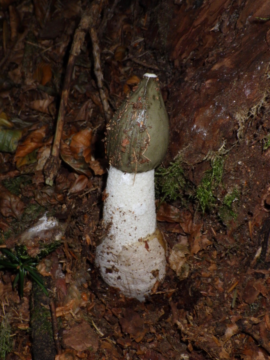 Bild 1+2: 18.10.18 8.45 Uhr Pilz mit noch fast intaktem grünem klebrigen stickendem Velum, gut zu erkennen die weisse Scheibe auf der Hutspitze (Funktion?) Der Pilz mass 14cm in der Höhe, der weisse Stiel war gut 3.5cm dick.